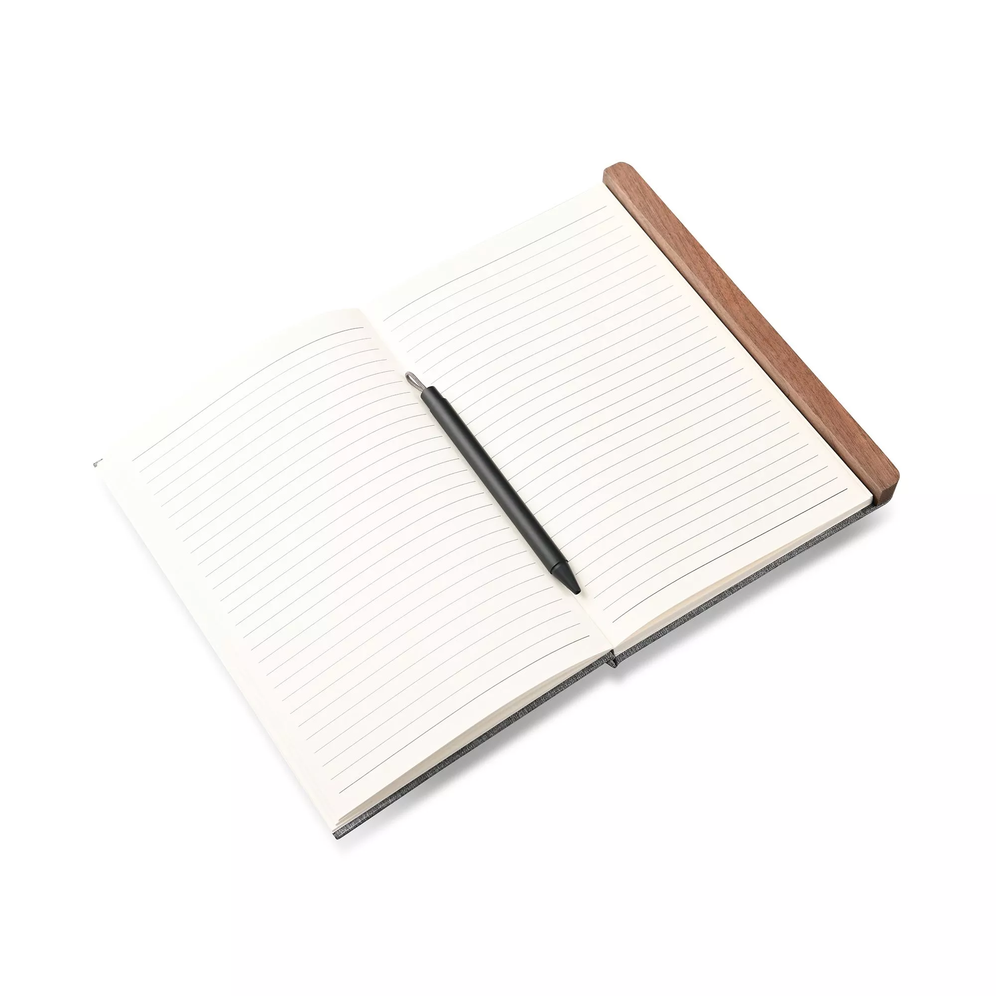 Невероятно оригинальная конструкция набора 2 в 1 - металлическая ручка скрыта и плотно держится в магнитном пенале из натурального дерева, закрепленном на задней обложке блокнота. При этом ручку легко извлечь, просто потянув за петельку на нажимной кнопке.