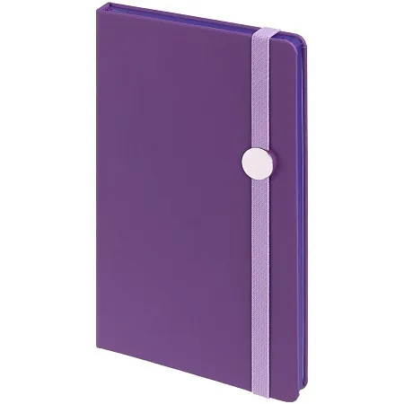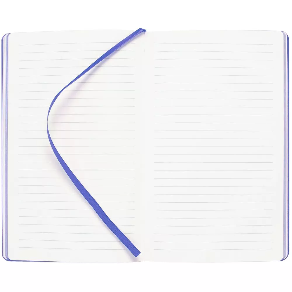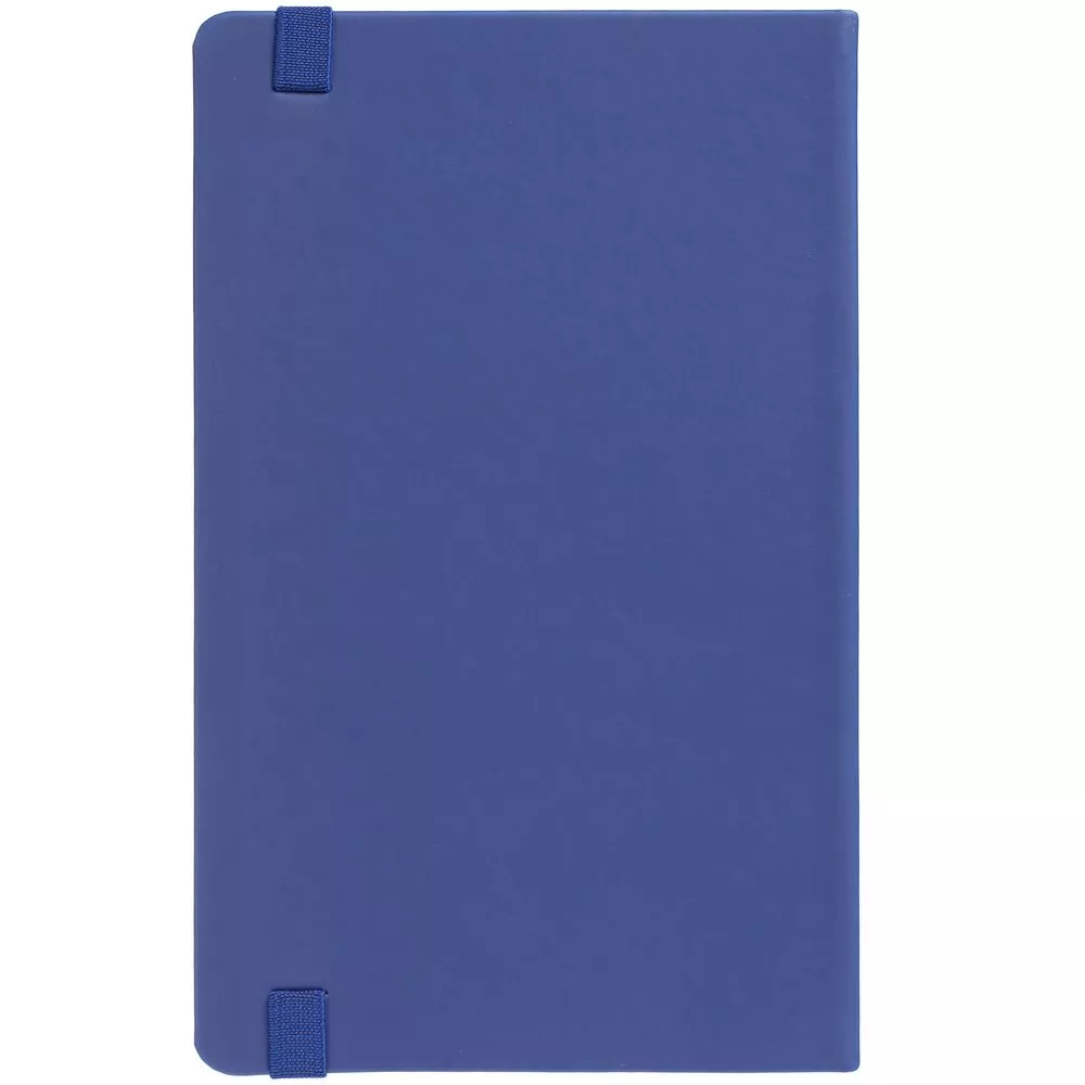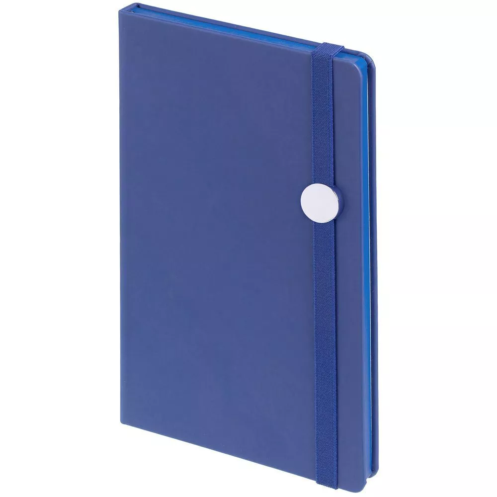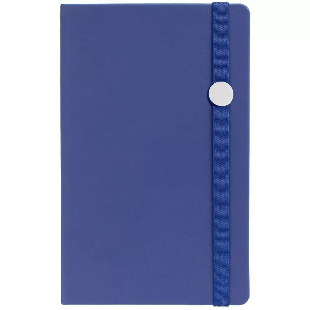 Блокнот в твердой обложке, выполнен из материала Soft Touch Ultra, синий НН, дополнен резинкой и ляссе в цвет обложки.