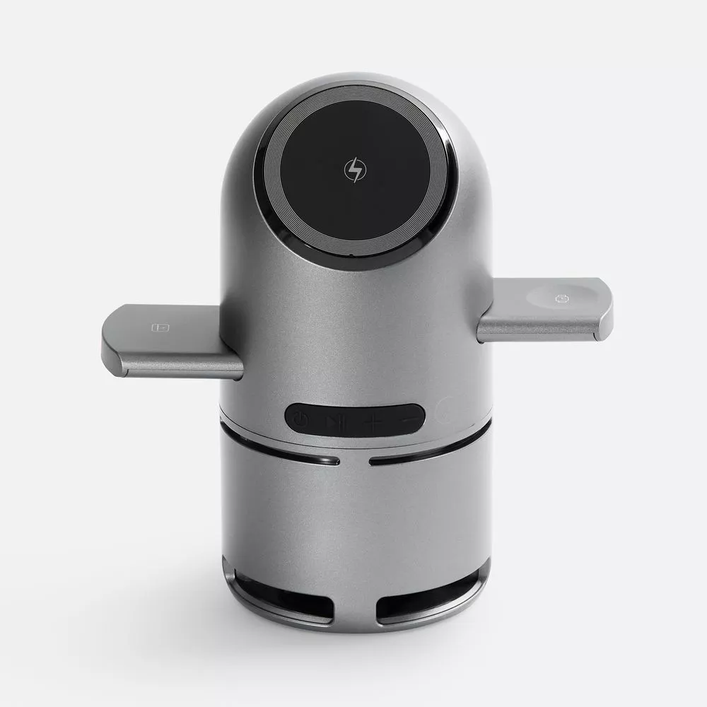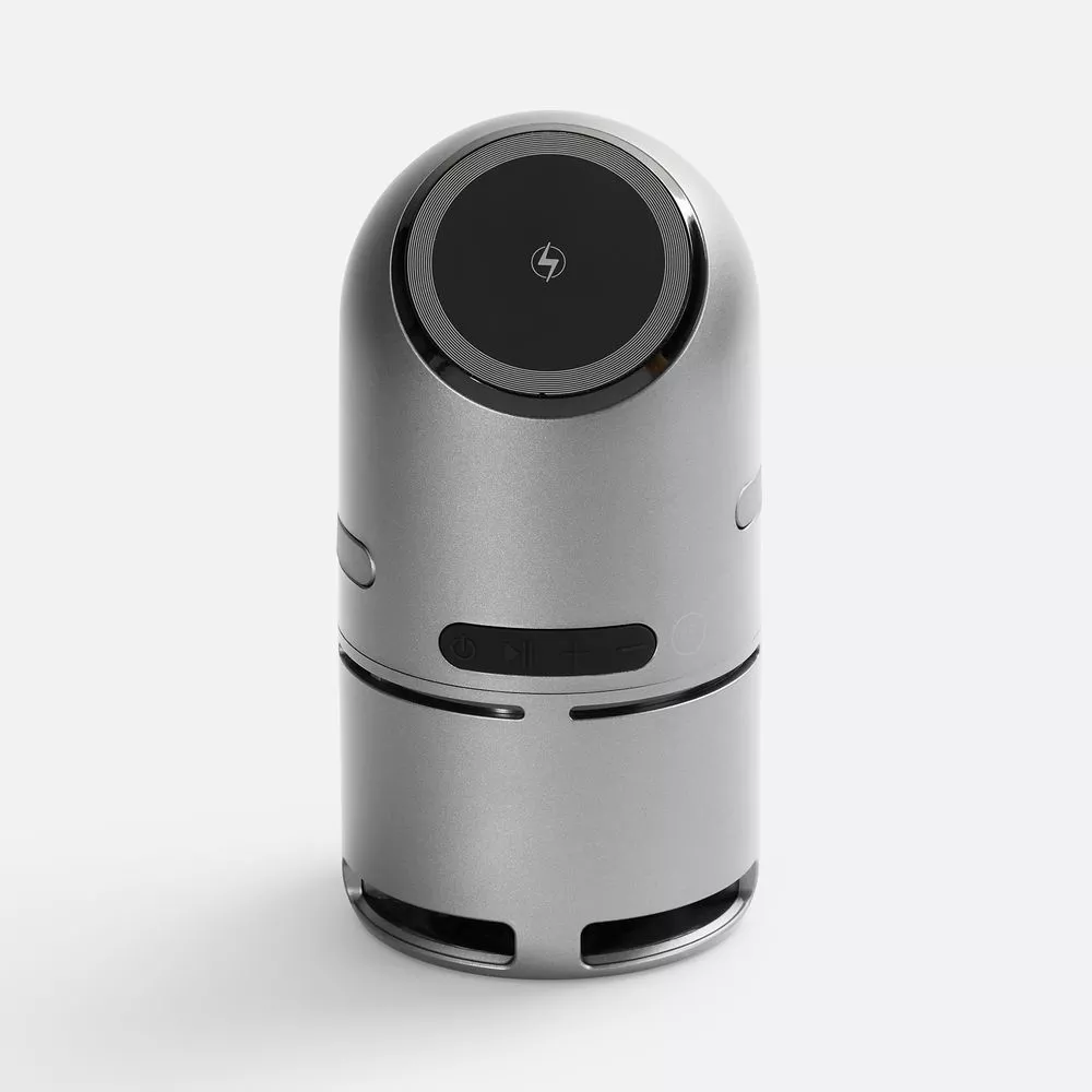 Droid — это технологичная Bluetooth-колонка с подвижными площадками для беспроводной зарядки смартфона, наушников и часов. Droid подразумевает активное тактильное взаимодействие с пользователем — если колонку погладить, появятся или исчезнут индукционные площадки для зарядки умных часов и наушников. Зарядная площадка для смартфона вращается на 90° — во время зарядки легко поменять ориентацию экрана с вертикальной на горизонтальную.
