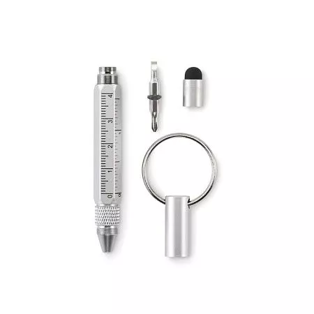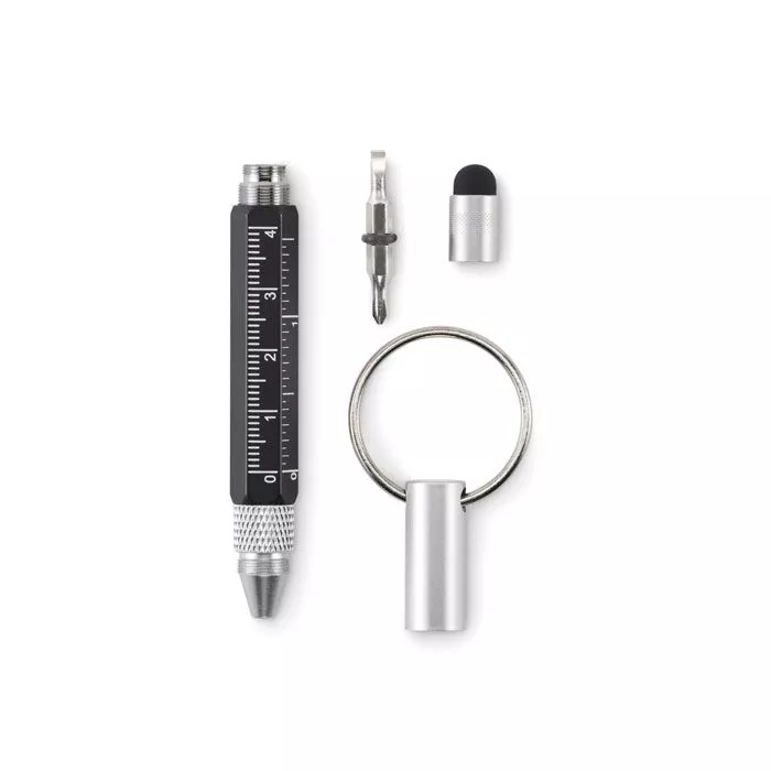 Брелок для ключей с поворотной ручкой из переработанного алюминия, линейкой на 4 см и 1,5 дюйма, стилусом и отверткой 2 в 1 с крестообразной и плоской насадками. Черные чернила.