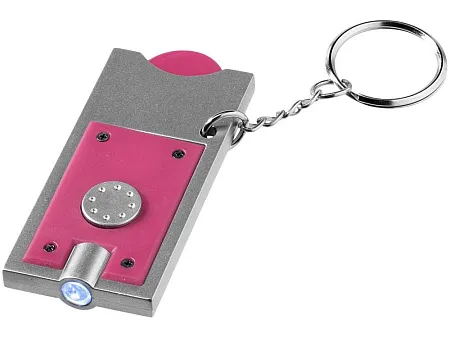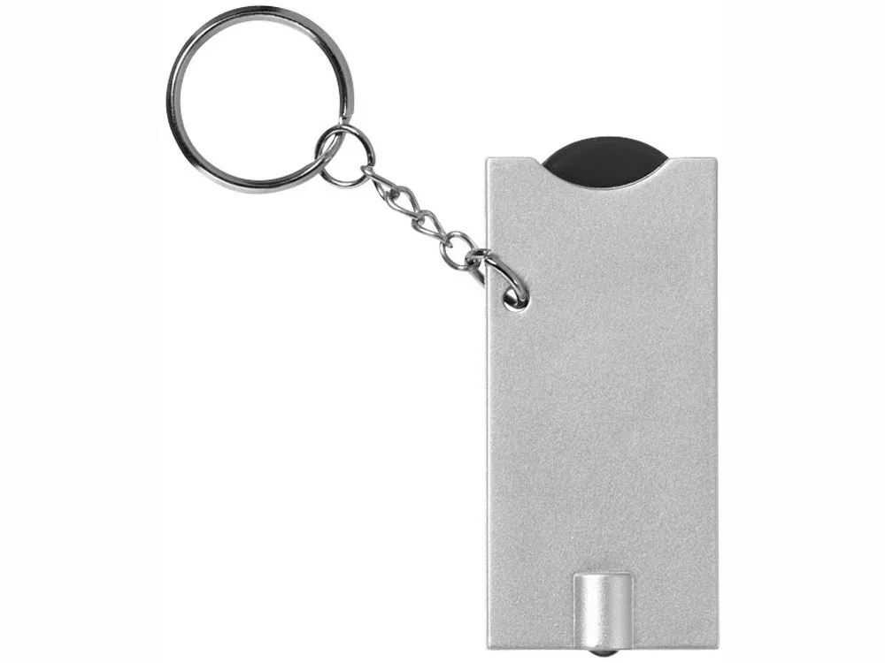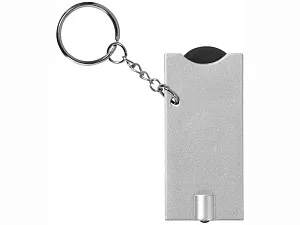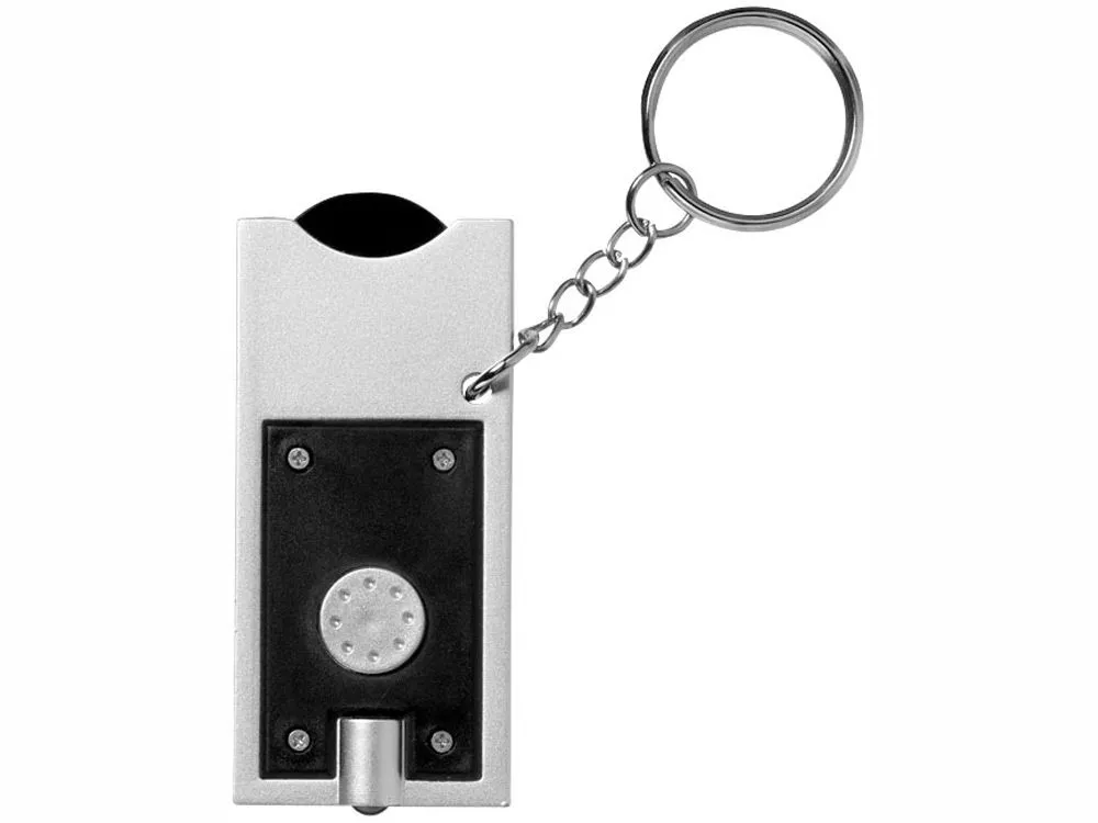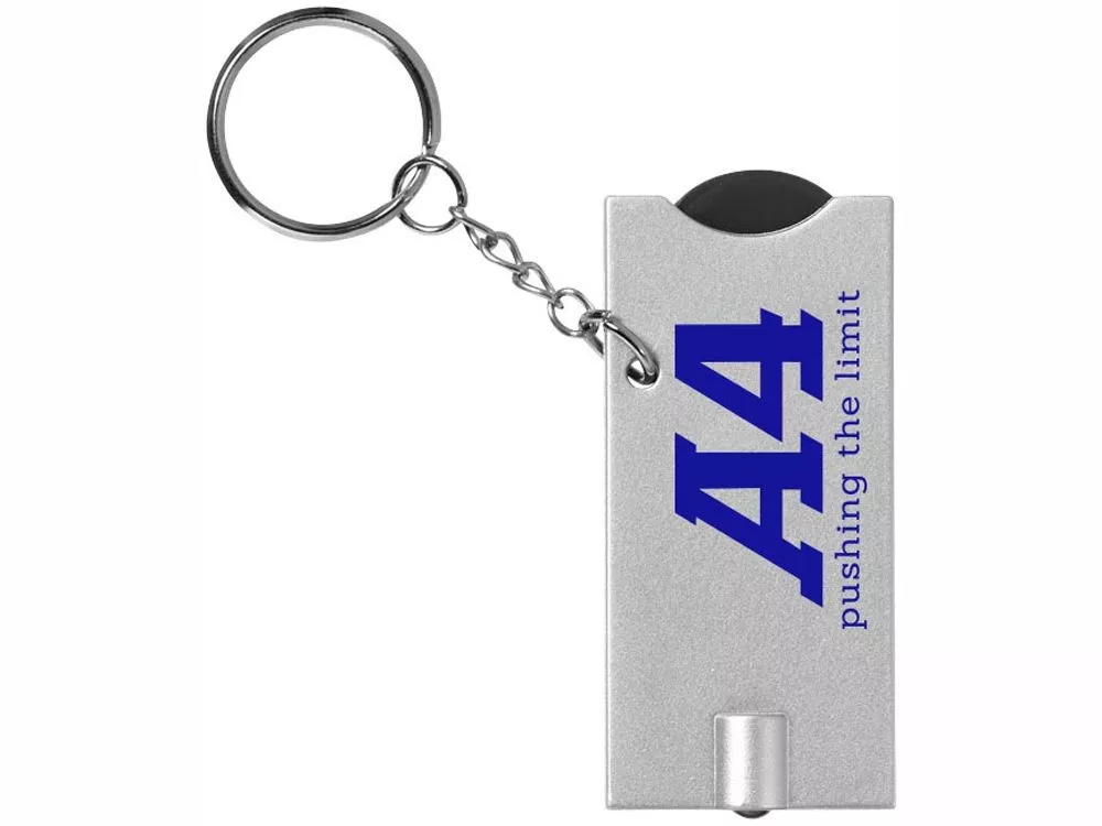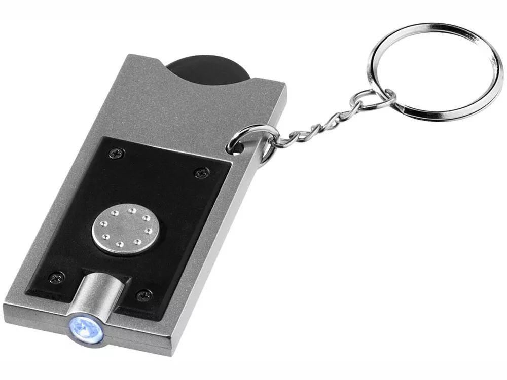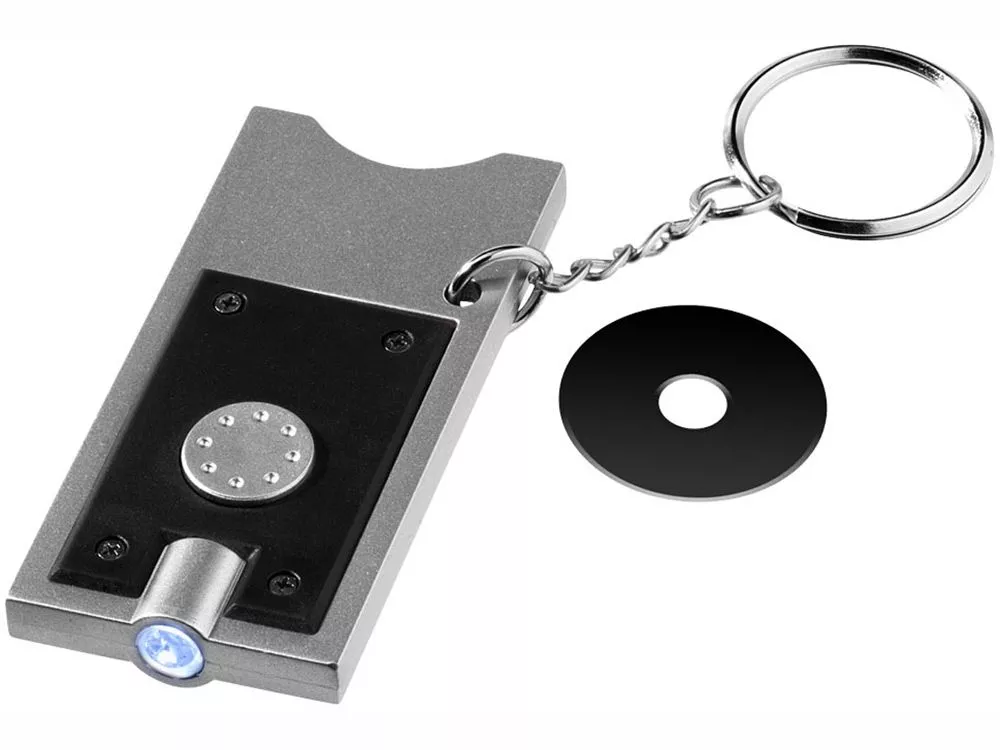 Пластиковый держатель для монет достоинством 1 евро размером Ø 6 мм с одним белым светодиодом для ключей. Металлическое кольцо для ключей Ø 25 мм.