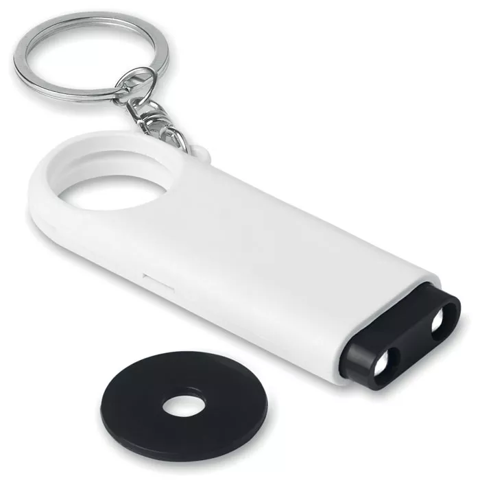 Брелок-фонарик с пластиковой монетой для получения тележки в магазине. 1 батарейка включена в комплект.