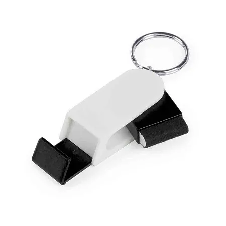 Пластиковый брелок с держателем для телефона и валиком для протирания экрана.