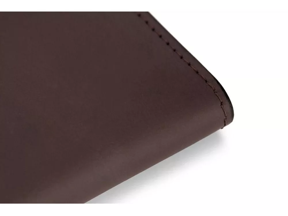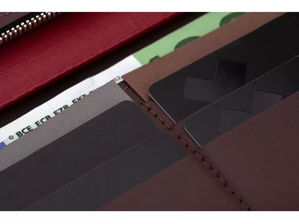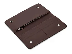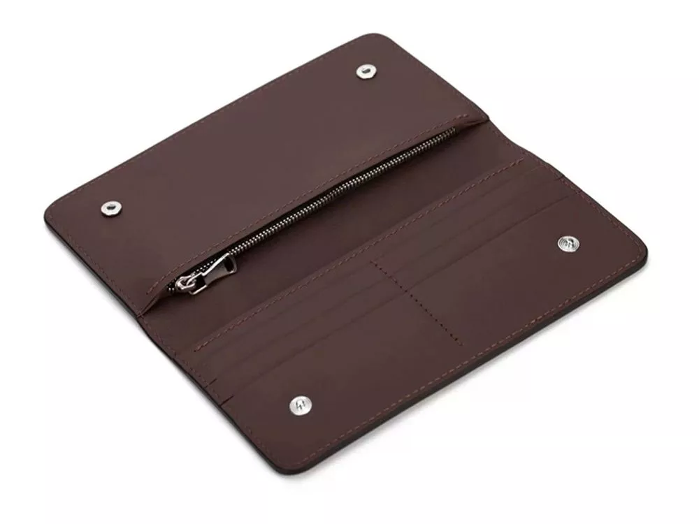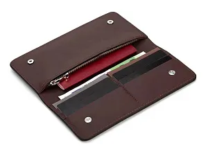 Внутри бумажника есть отделения для карт, купюр и широкое отделение, застегивающееся на молнию. Бумажник закрывается на кнопки, это сделано для того, чтобы он оставался закрытым где бы вы его не носили. Края бумажника окрашены в ручную. - 6 отделений для карточек - 2 отделение для денег - Большое отделение на молнии