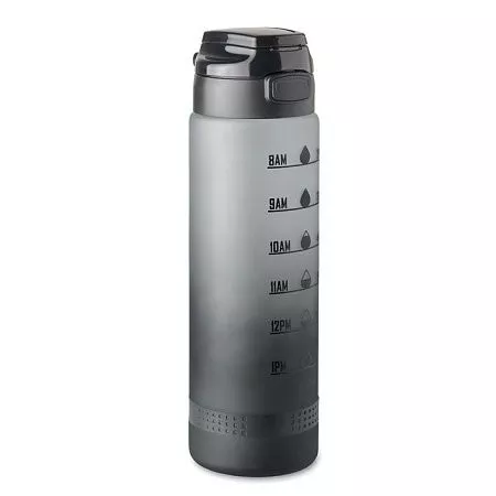 Спортивная бутылка для воды из переработанного пластика с разметкой, регулирующей потребление жидкости, откидной крышкой, замком безопасности и ремешком для переноски. Вместимость: 1 л.