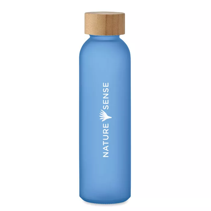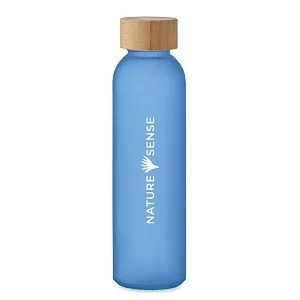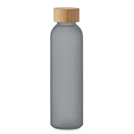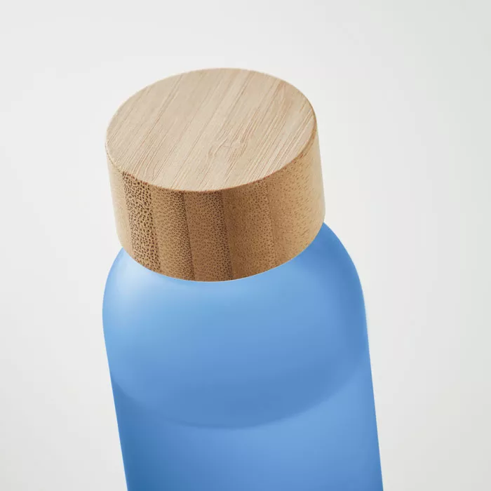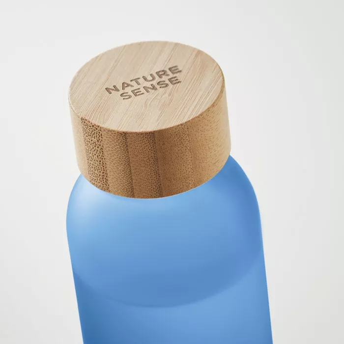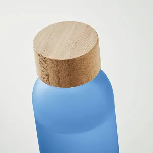 Стеклянная бутылка с матовым покрытием и бамбуковой крышкой. Герметична. Емкость: 500 мл.