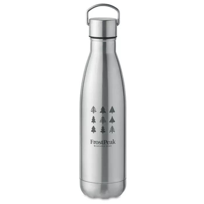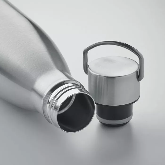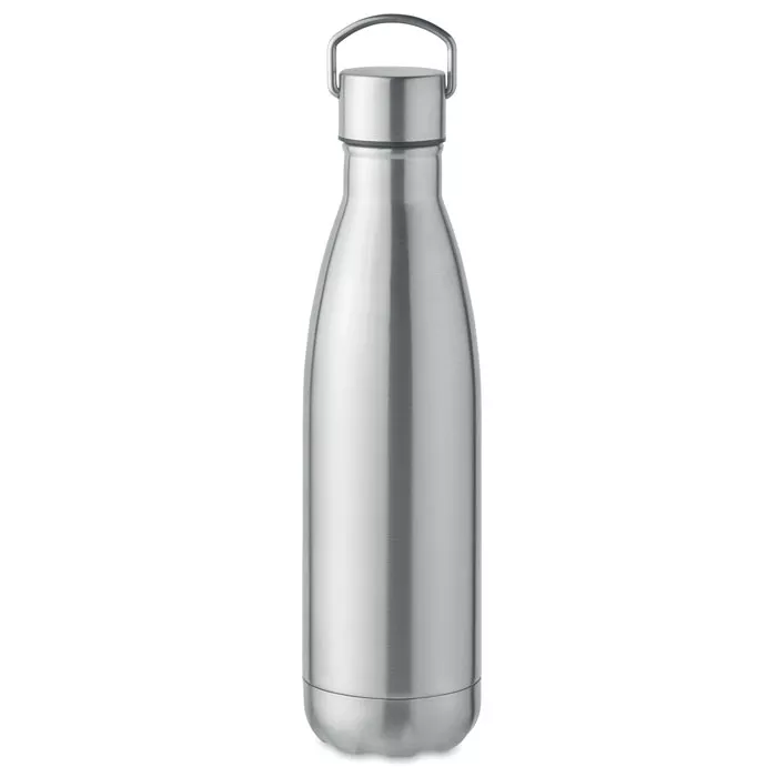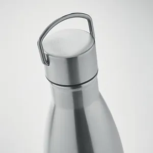 Термобутылка с двойными стенками из нержавеющей стали (90% переработанной нержавеющей стали и 10% нержавеющей стали) с крышкой и ручкой. Герметична. Емкость: 500 мл.