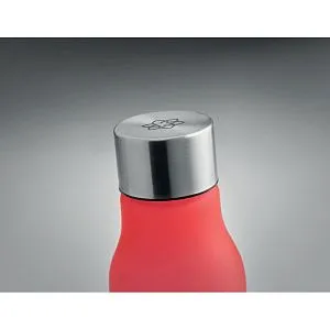 Питьевая пластиковая бутылка (RPET) с прорезиненным покрытием и крышкой из нержавеющей стали и пластика с внутренней стороны (RPET), а также силиконовым кольцом. Полная герметичность. Емкость: 600 мл.Не протекает.