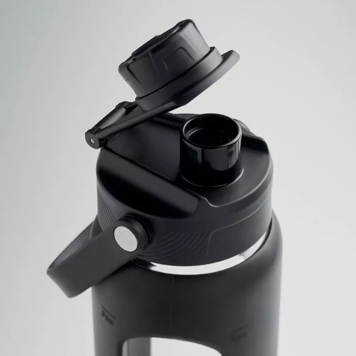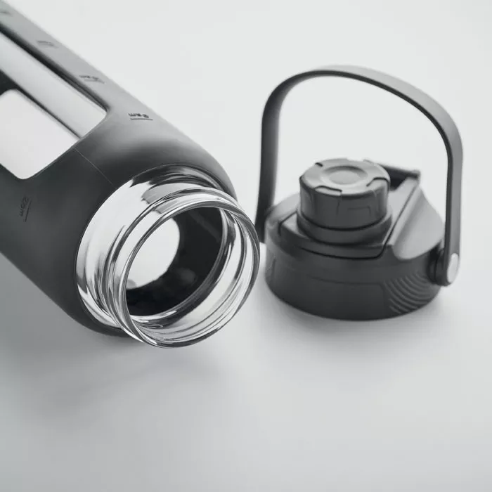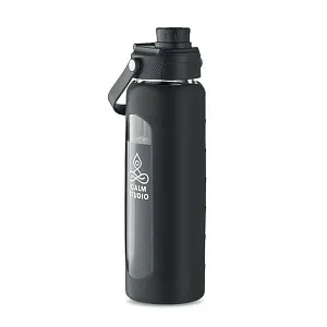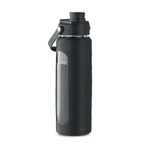 Бутылка из боросиликатного стекла с силиконовой прозрачной вставкой и полипропиленовой крышкой с ручкой для переноски. Герметична. Емкость: 750 мл.