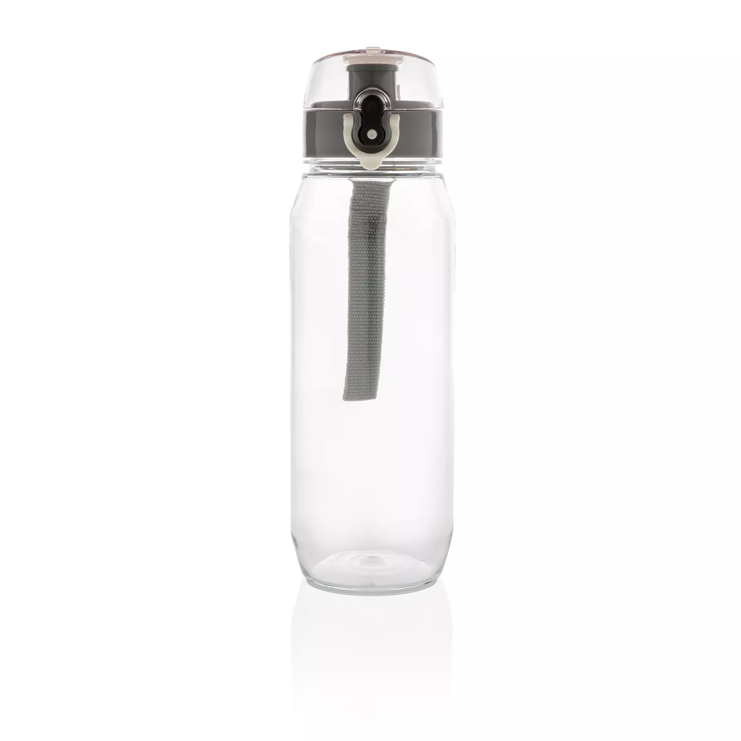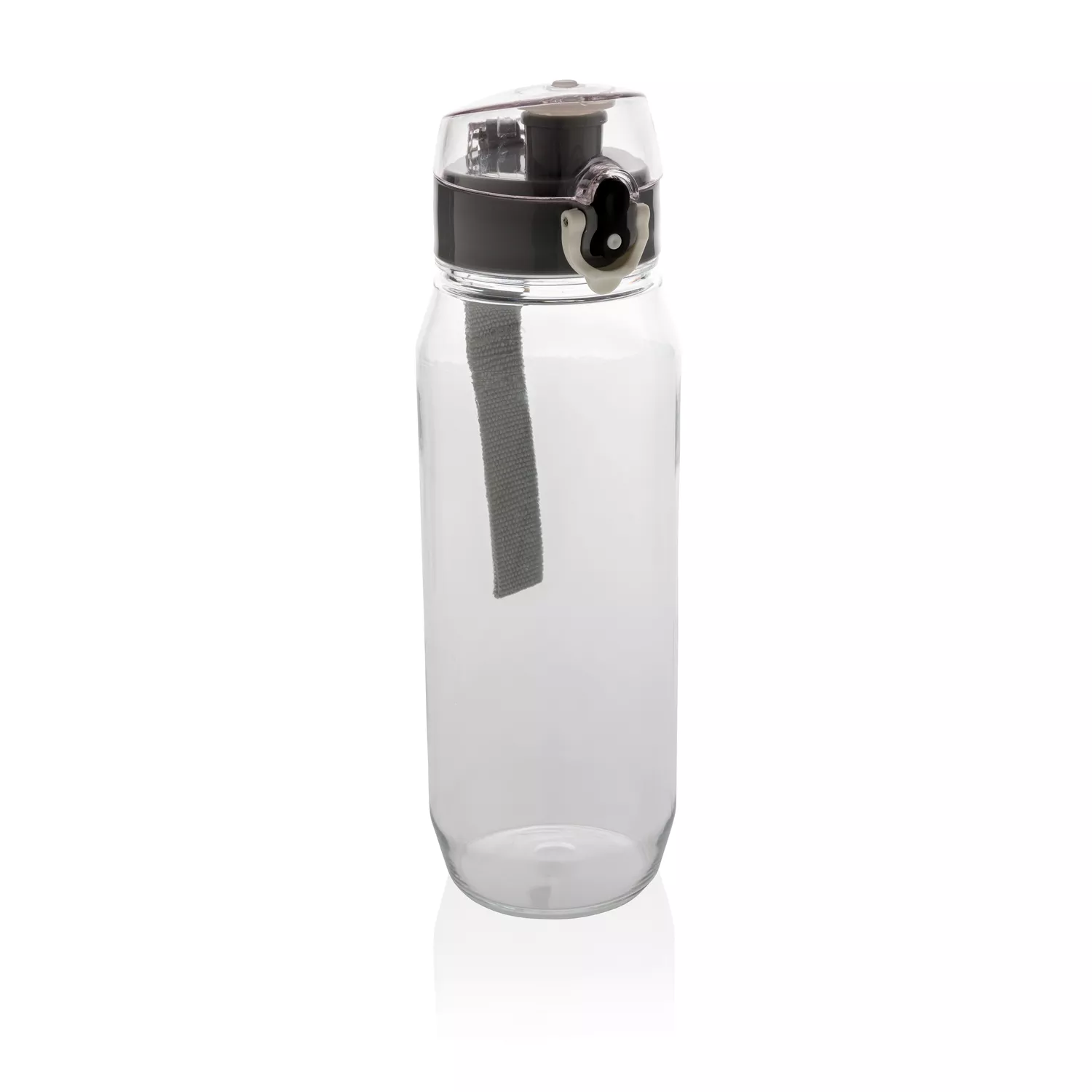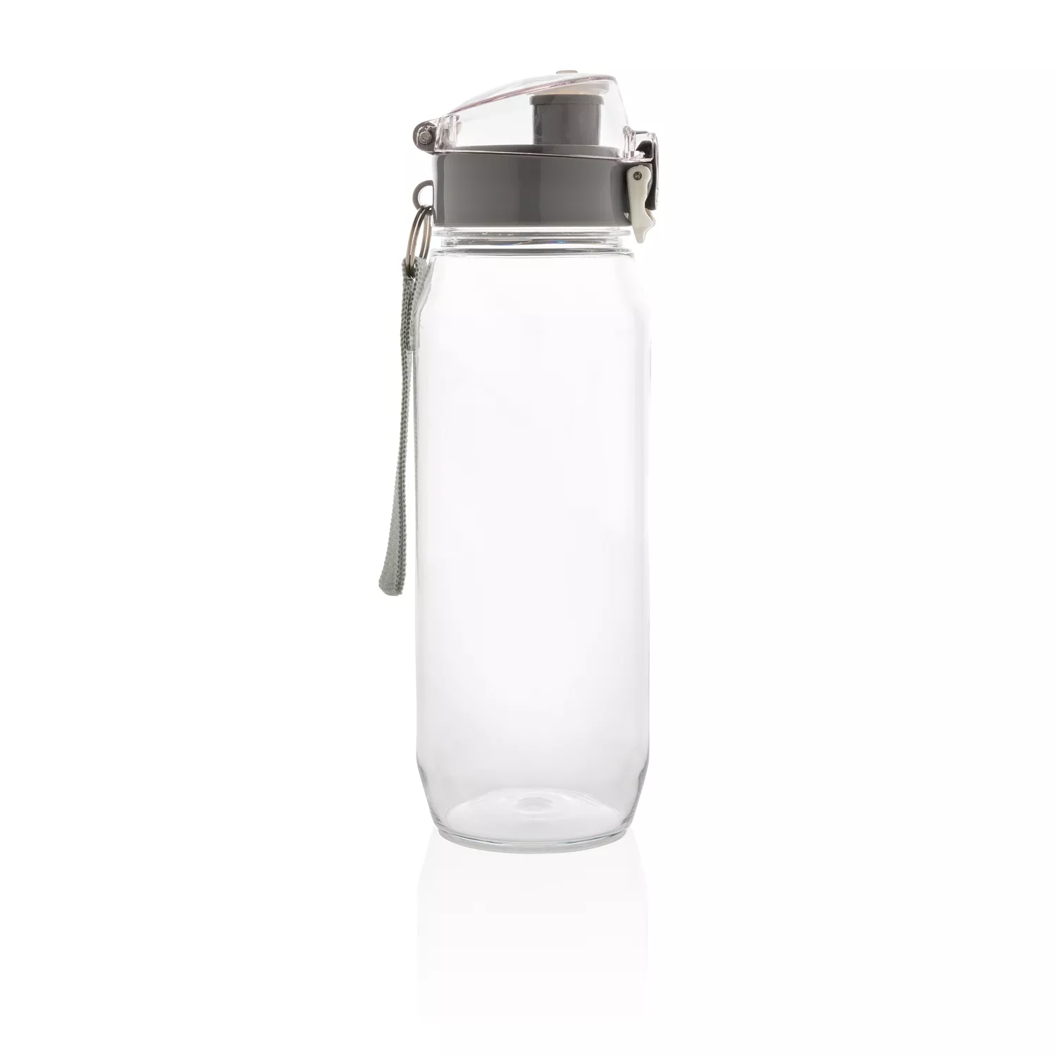 Бутылка для воды Tritan объемом 800 мл. Прозрачная бутылка из экологичного материала, который не впитывает запахи и не содержит бисфенол. У бутылки удобная крышка, которая открывается нажатием на кнопку, есть фиксатор, который не позволит бутылке случайно открыться во время движения. В комплект входит ремешок для запястья.