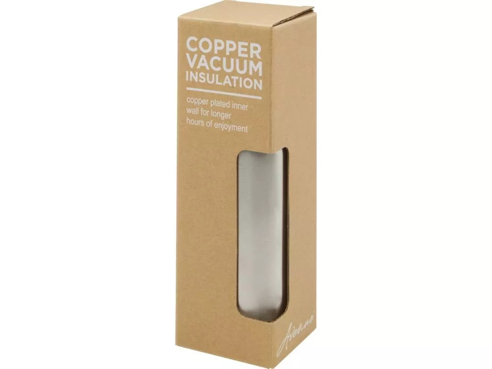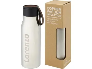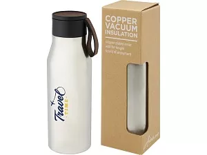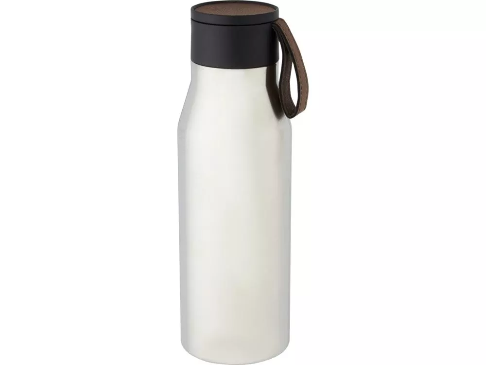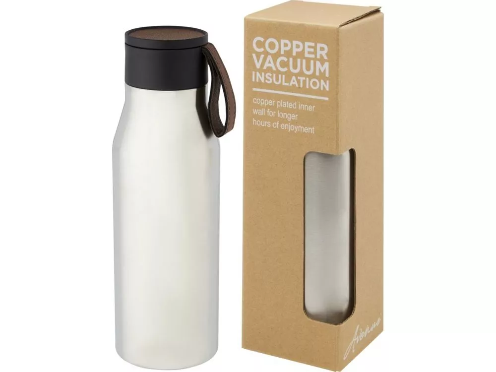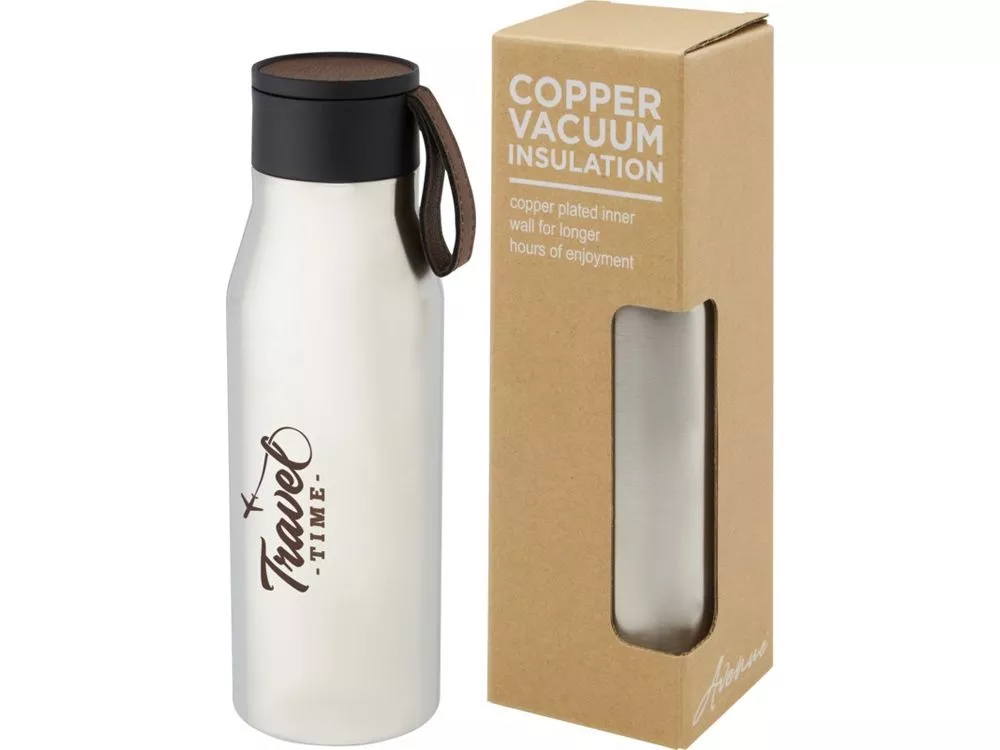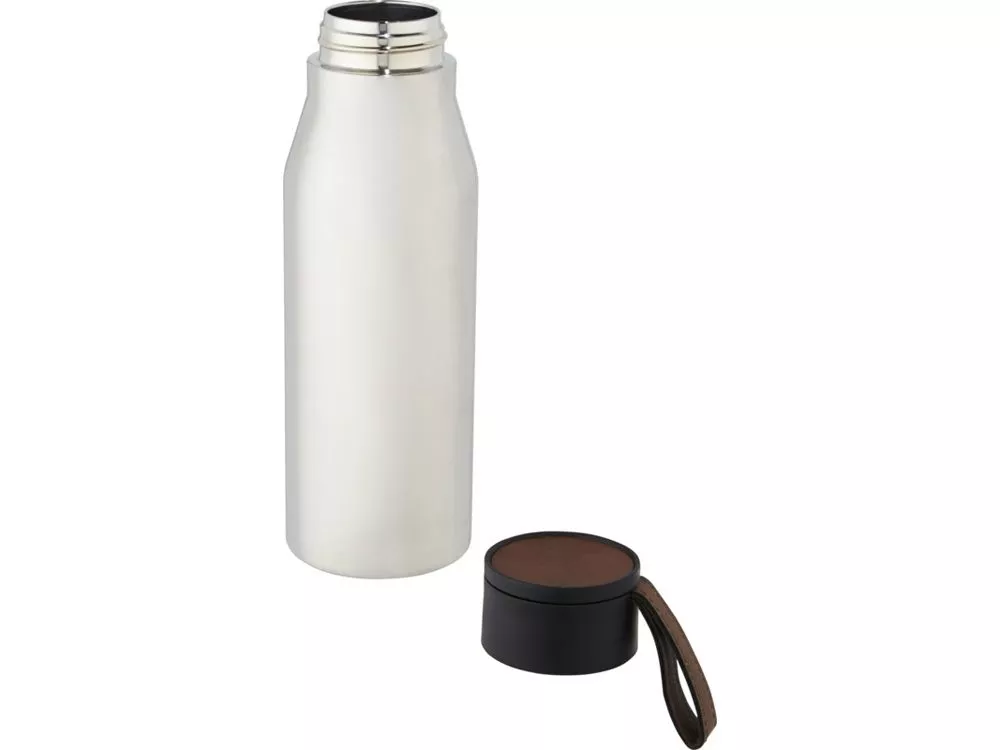 Бутылка из нержавеющей стали с медной вакуумной изоляцией, выполненная в классическом и элегантном дизайне. Имеет ремешок из искусственной кожи ПУ и элемент на крышке. Идеальный вариант для лазерной гравировки, чтобы выделить логотип серебристым цветом и создавать красивый визуальный эффект. Благодаря двустенной конструкции, медной вакуумной изоляции и нержавеющей стали 18/8 напитки несколько часов остаются горячими или холодными. Протестировано и одобрено согласно немецкому законодательству о безопасности пищевых продуктов (LFGB), а также проверено на содержание фталатов согласно нормам REACH. Объем 500 мл. В коробке из переработанного картона.