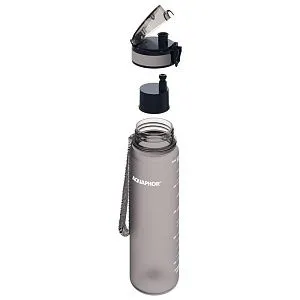 Матовое бархатистое покрытие бутылки приятно на ощупь, широкий ремешок дополнительно фиксирует бутылку во время использования, защитный колпачок не даст воде пролиться в сумке.