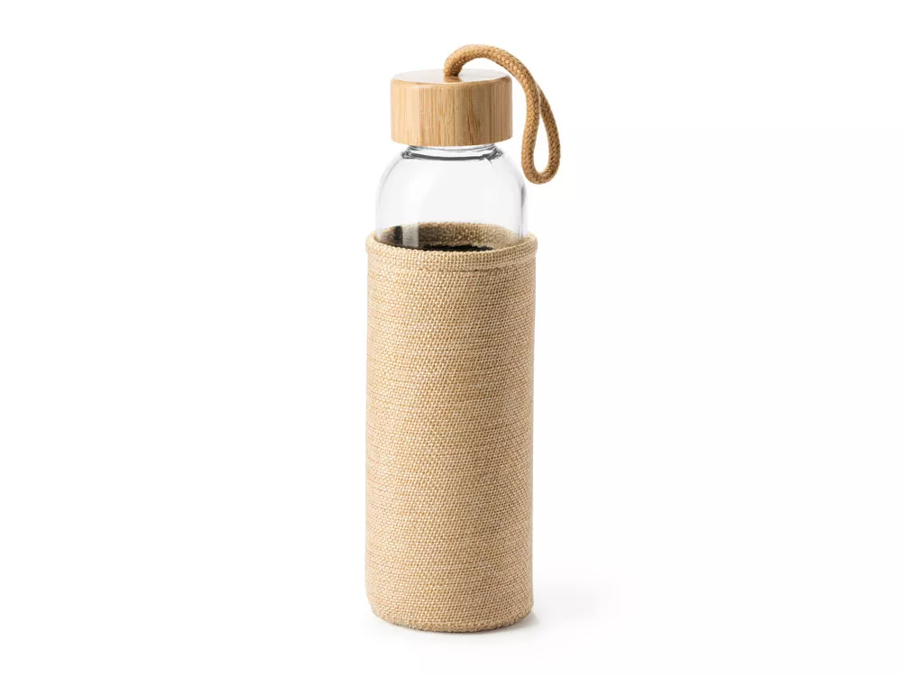 Стеклянная бутылка с оригинальным чехлом, имитирующим джут, и бамбуковой крышкой с практичной ручкой для переноски. Емкость 500 мл.