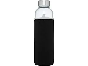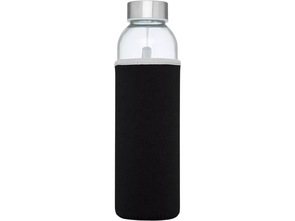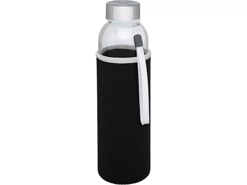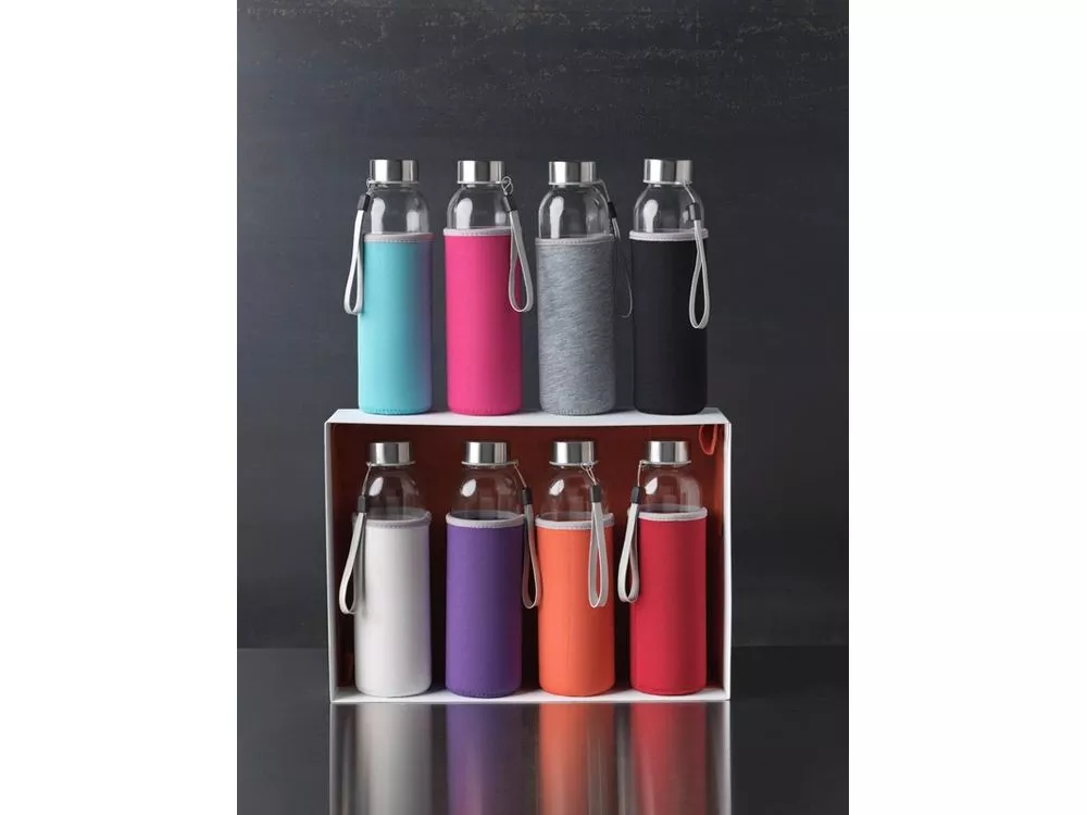 Стеклянная бутылка с одинарными стенками и съемной крышкой. На крышке есть ремешок для легкой переноски, кроме того имеется чехол из неопрена. Рекомендуется использовать для холодных напитков. Не замораживать, не разогревать в микроволновой печи. Объем 500 мл. Уложена в подарочную коробку. Трафаретная печать круговая (1 цвет (цветные изделия)) на данный товар осуществляется бесплатно. Оплачивается только настройка оборудования в размере 5700 рублей на весь тираж.