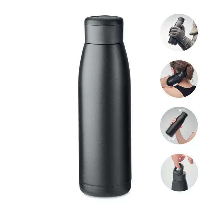 Бутылка с двойными стенками из переработанной нержавеющей стали (90%) и обычной нержавеющей стали (10%) и мягкой силиконовой крышкой с кольцом для переноски. При простом встряхивании бутылки температура меняется на нагрев или охлаждение, в зависимости от жидкости внутри. Герметична. Объем: 400 мл.