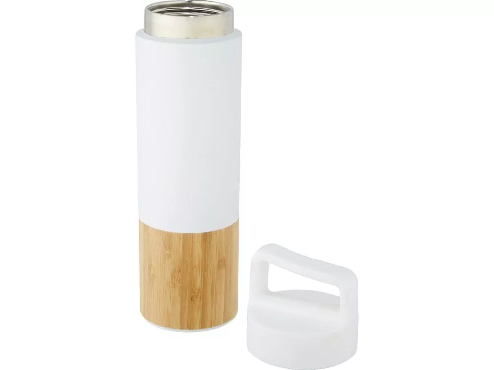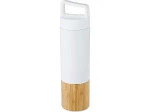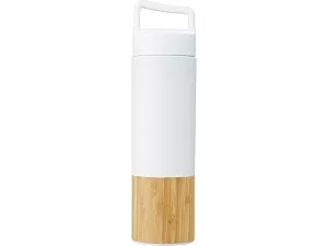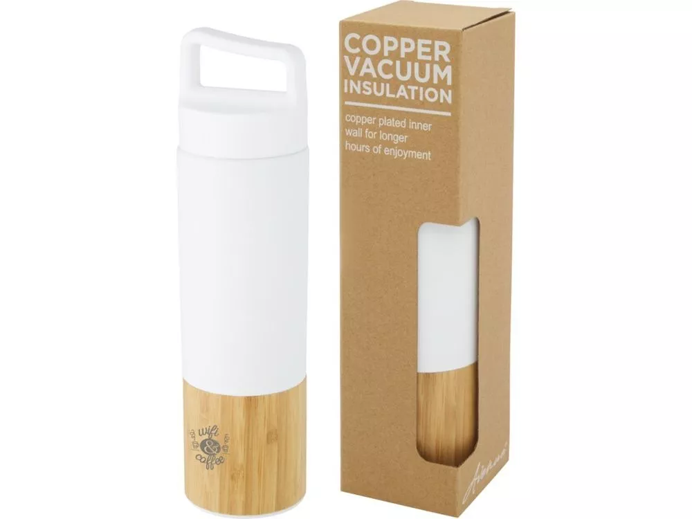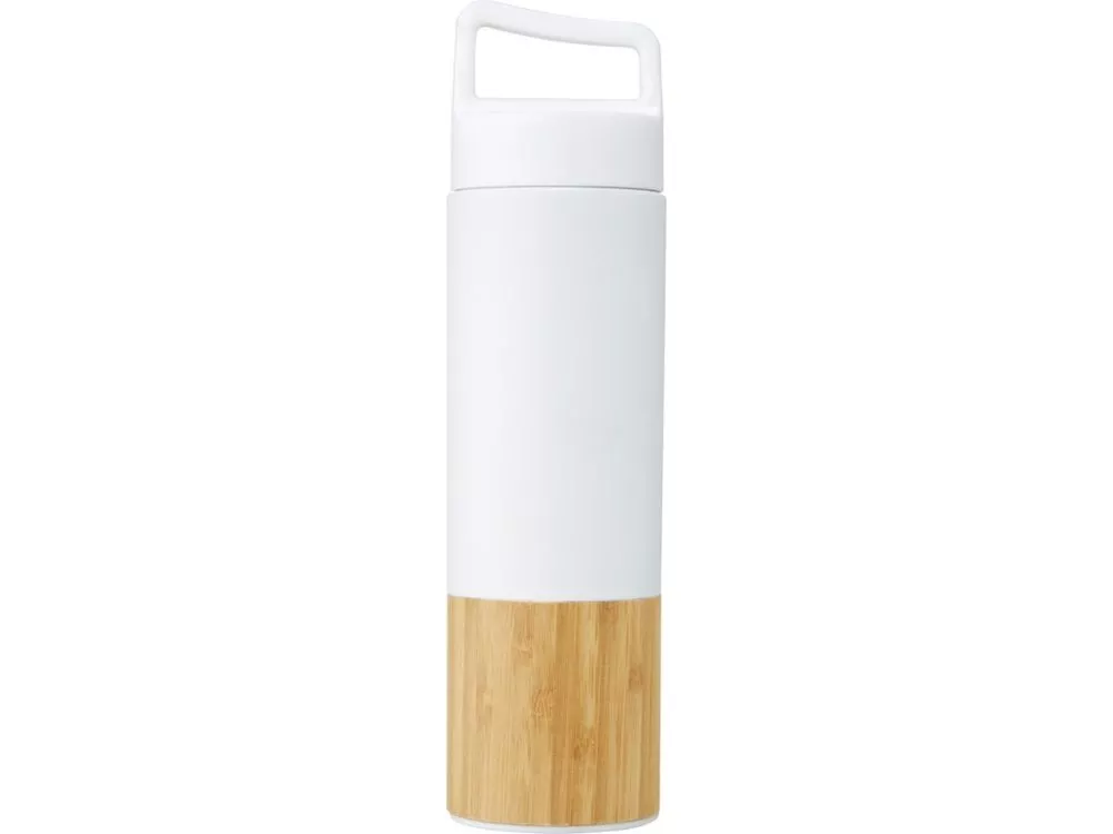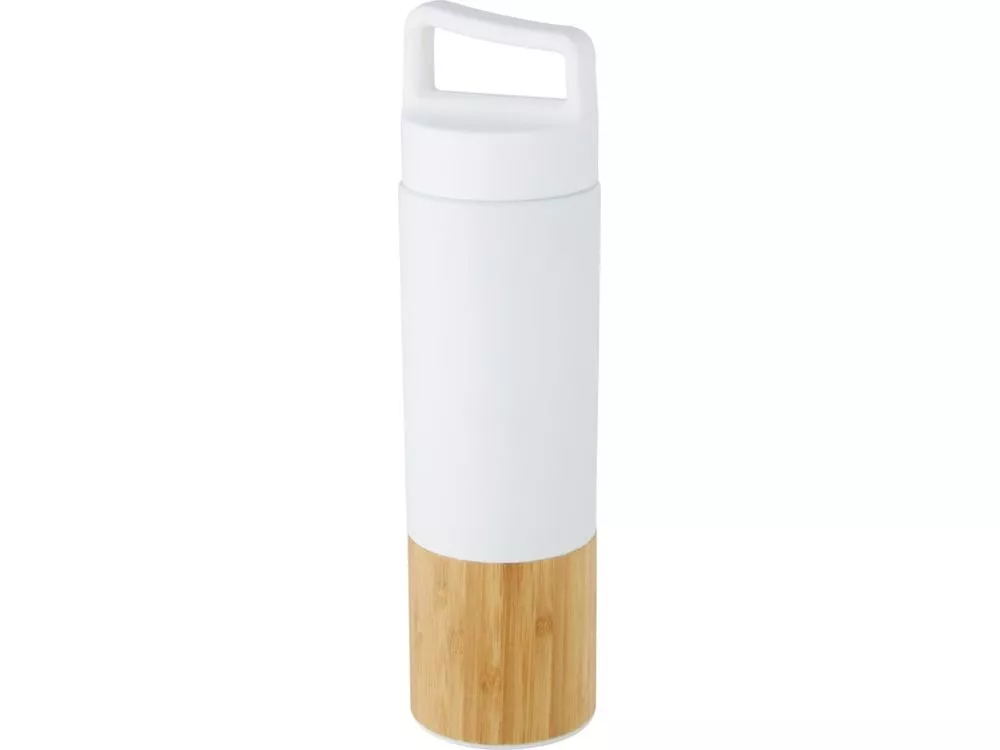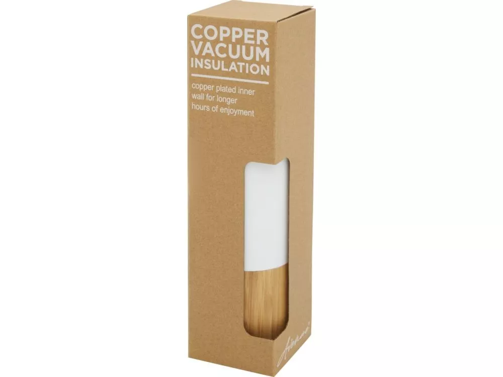 Бутылка из нержавеющей стали 18/8 с медной ваккумной изоляцией, которая сохраняет напитки горячими или холодными в течение нескольких часов. Имеет модный элемент из бамбука; бутылку легко носить с собой благодаря ручке на верхней части крышки. Бутылка имеет широкое горлышко, поэтому ее легко наполнять и мыть. Протестировано и одобрено согласно немецкому законодательству о безопасности пищевых продуктов (LFGB), а также проверено на содержание фталатов согласно нормам REACH. Объем 540 мл. В коробке из переработанного картона. Нержавеющая сталь, бамбуковое дерево.