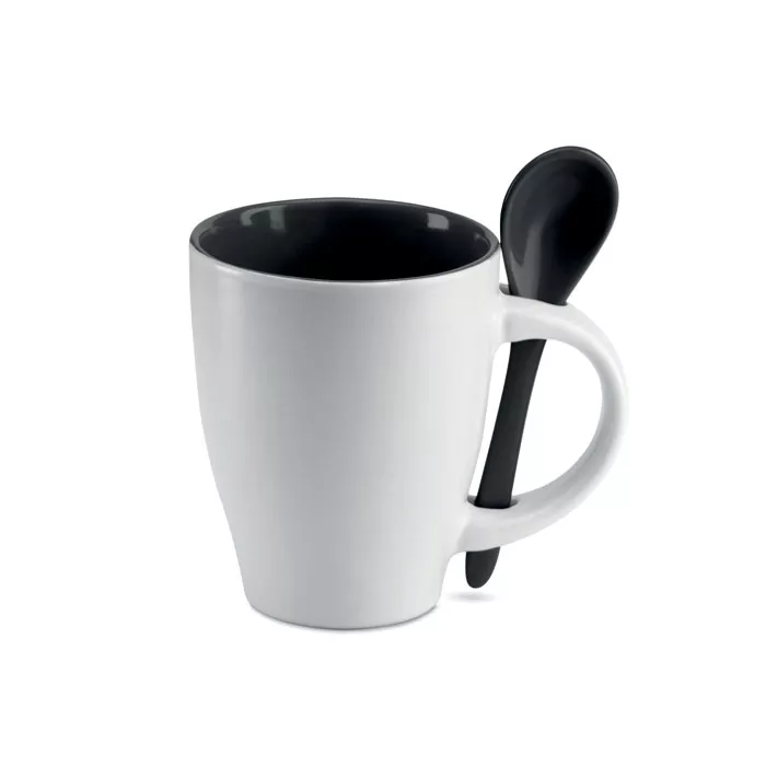 Кофейная двухцветная чашка с цветной ложкой. Объем чашки 250 мл. Тампопечать: нельзя мыть в посудомоечной машине. Деколь: можно мыть в посудомоечной машине.