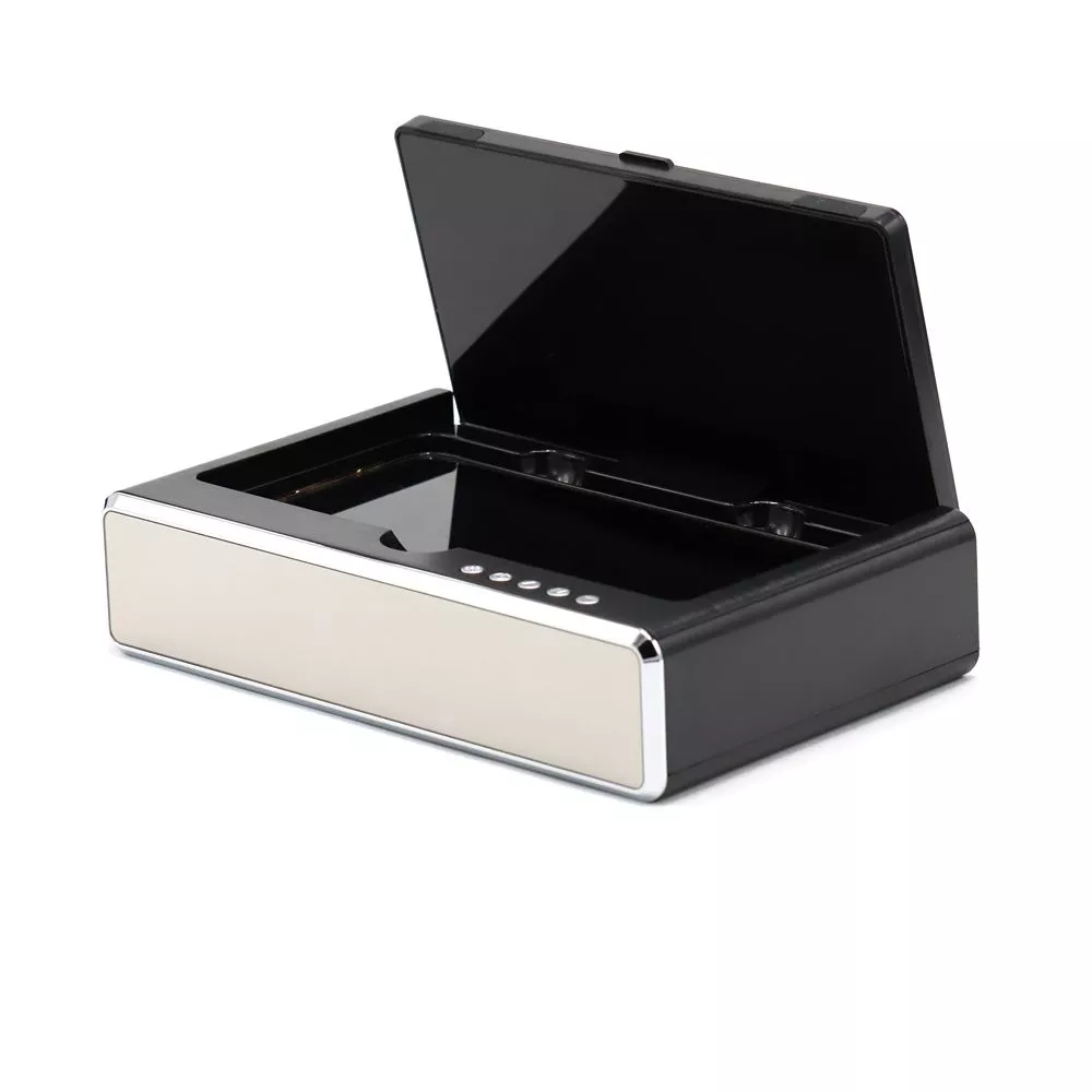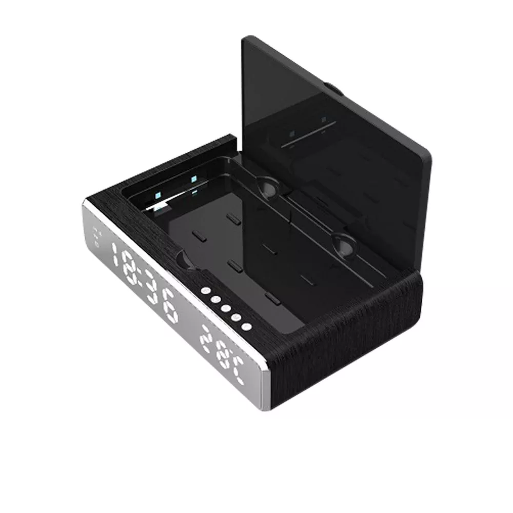 Отличное современное приобретение – это электронные цифровые часы Boxxuv со сдержанным дизайном, наличием емкости для стерилизации телефона, часов, ключей и прочих карманных мелочей. Дополнительно имеет функцию отображения времени и температуры на экране, и самая необходимая функция – это порт беспроводной зарядки по технологии Qi, все вместе – high tech подарок для любого события! Функции: Время / Температура / Будильник / Стерилизация / Беспроводная зарядка Qi