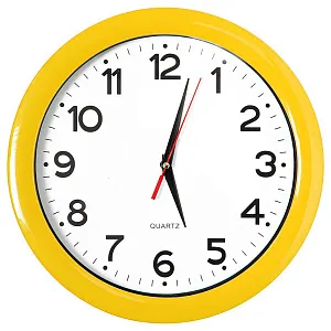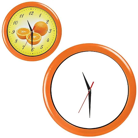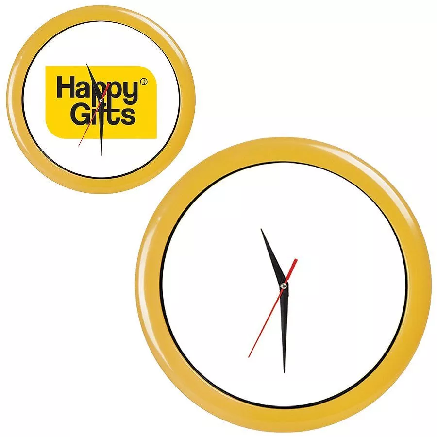 Pantone 123 C Часы настенные с кварцевым механизмом, работают от 1 батарейки АА. Предназначены для вставки циферблата с печатью по индивидуальному дизайну Комплектация: 1) корпус с часовым механизмом, 2) минеральное стекло, 3) ободок, 4) стрелки - 3 шт. (часовая и минутная стрелки - черного цвета, секундная - красного цвета). Для удобства вставки циферблата с печатью по индивидуальному дизайну, стрелки часов не зафиксированы и поставляются в отдельном пакетике) 5) Муляж циферблата (диаметр 235 мм) Для вставки используется мелованная бумага матовая 300 гр.