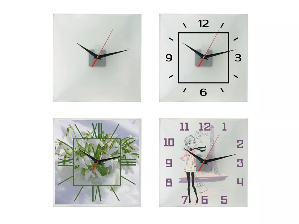 Часы предназначены для нанесения циферблата на стекло по индивидуальному дизайну с помощью технологии цифрового термотрансфера: на оборотную сторону циферблата заводским способом нанесена специальная пленка. Изображение печатают на обычной глянцевой бумаге, а затем закрепляют на циферблате термопрессом — пленка плавится, и бумага с печатью плотно припаивается к стеклу. Часы поставляются без батареек.