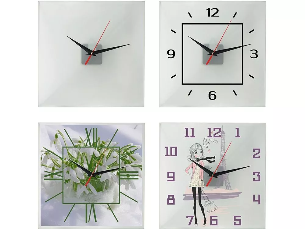 Часы предназначены для нанесения циферблата на стекло по индивидуальному дизайну с помощью технологии цифрового термотрансфера: на оборотную сторону циферблата заводским способом нанесена специальная пленка. Изображение печатают на обычной глянцевой бумаге, а затем закрепляют на циферблате термопрессом — пленка плавится, и бумага с печатью плотно припаивается к стеклу. Часы поставляются без батареек.