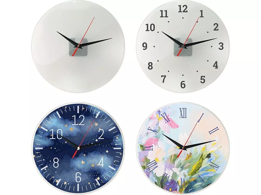 Часы предназначены для нанесения циферблата на стекло по индивидуальному дизайну с помощью технологии цифрового термотрансфера: на оборотную сторону циферблата заводским способом нанесена специальная пленка. Изображение печатают на обычной глянцевой бумаге, а затем закрепляют на циферблате термопрессом — пленка плавится, и бумага с печатью плотно припаивается к стеклу. Часы поставляются без батареек.