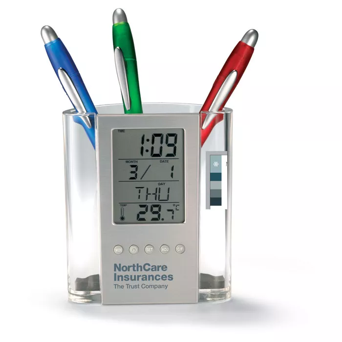 Подставка для ручек с календарем, будильником и термометром. Батарейка в комплекте