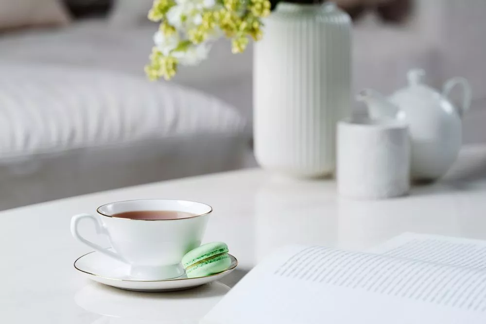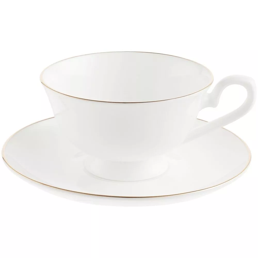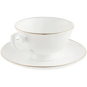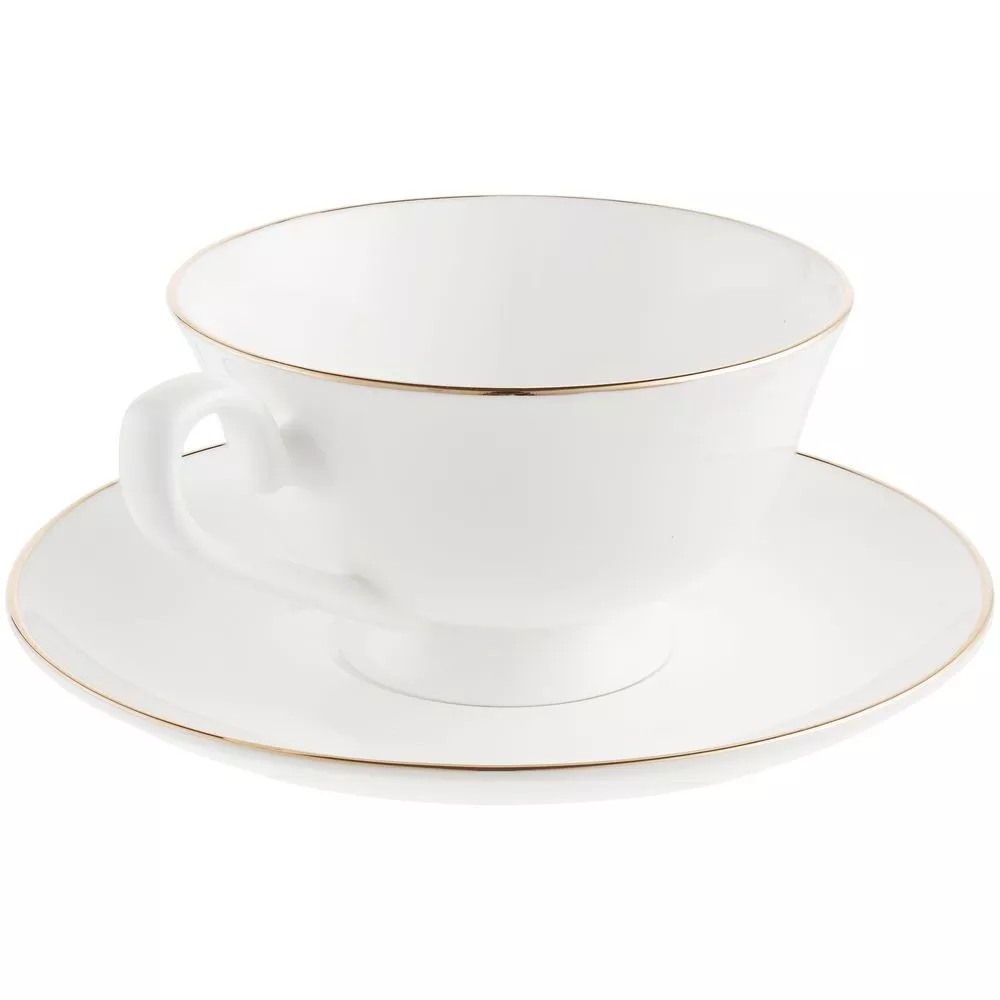 Изящная пара с тонкими стенками и золотистой каймой.Емкость чашки 220 мл. Поставляется в белой картонной коробке.
