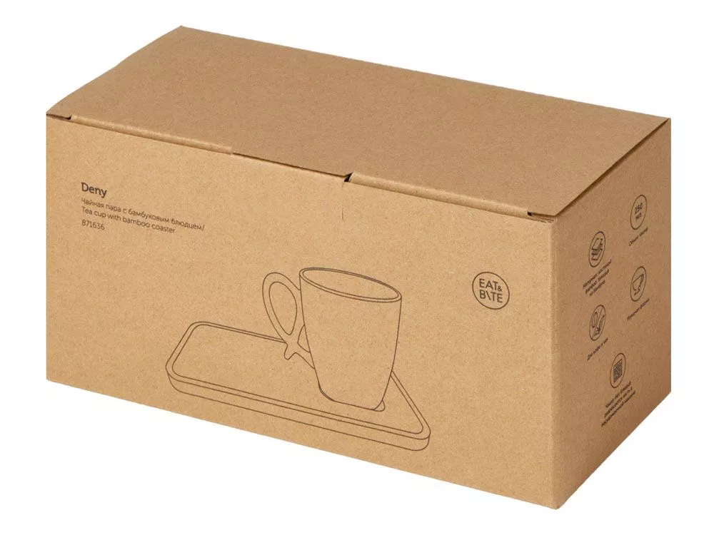 Чашка изготовлена из костяного фарфора, - более тонкого и изящного по сравнению с обычной глиняной керамикой, и прекрасно подойдёт не только для чая, но и для кофе (объём 250 мл). Бамбуковое блюдце имеет выемку для чашки, поэтому Deny можно аккуратно разместить на столе, не занимая много места. Также на блюдце удобно класть пирожные, шоколад или печенье благодаря его прямоугольной форме. Чайная пара от бренда Eat&Bite смотрится эстетично и красиво из-за нестандартного дизайна - фигурной ручки чашки и квадратного донышка, которое точно подходит под выемку блюдца. - стильный и необычный дизайн; - объём чашки 250 мл; - костяной фарфор и бамбук; - компактное хранение; - блюдце для пирожных или печенья. Гравировка (CO2 лазер) (Без чернения) на данный товар осуществляется бесплатно. Оплачивается только настройка оборудования в размере 1100 рублей на весь тираж.