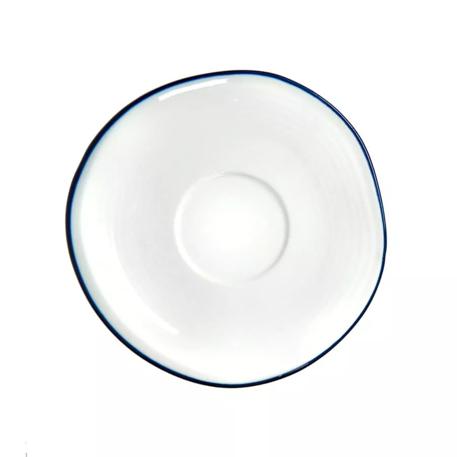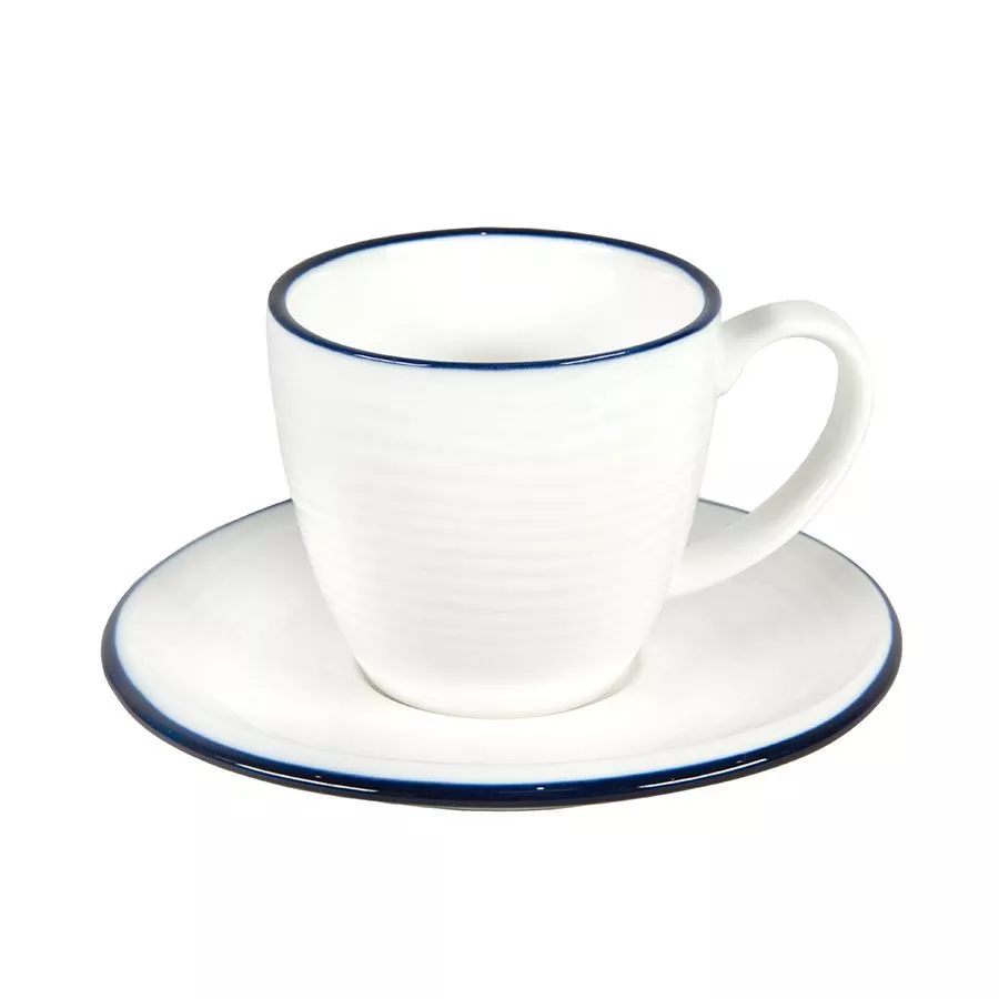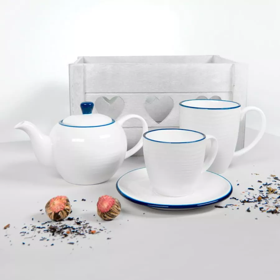Чайная пара выполнена в классическом нежном дизайне. Синий кант по верху изделия Волнообразное покрытие чашки, похожее на рябь на поверхности воды и неровная форма блюдца отсылает нас к категории продуктов hand-made Подарочная картонная коробка "крышка дно"