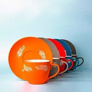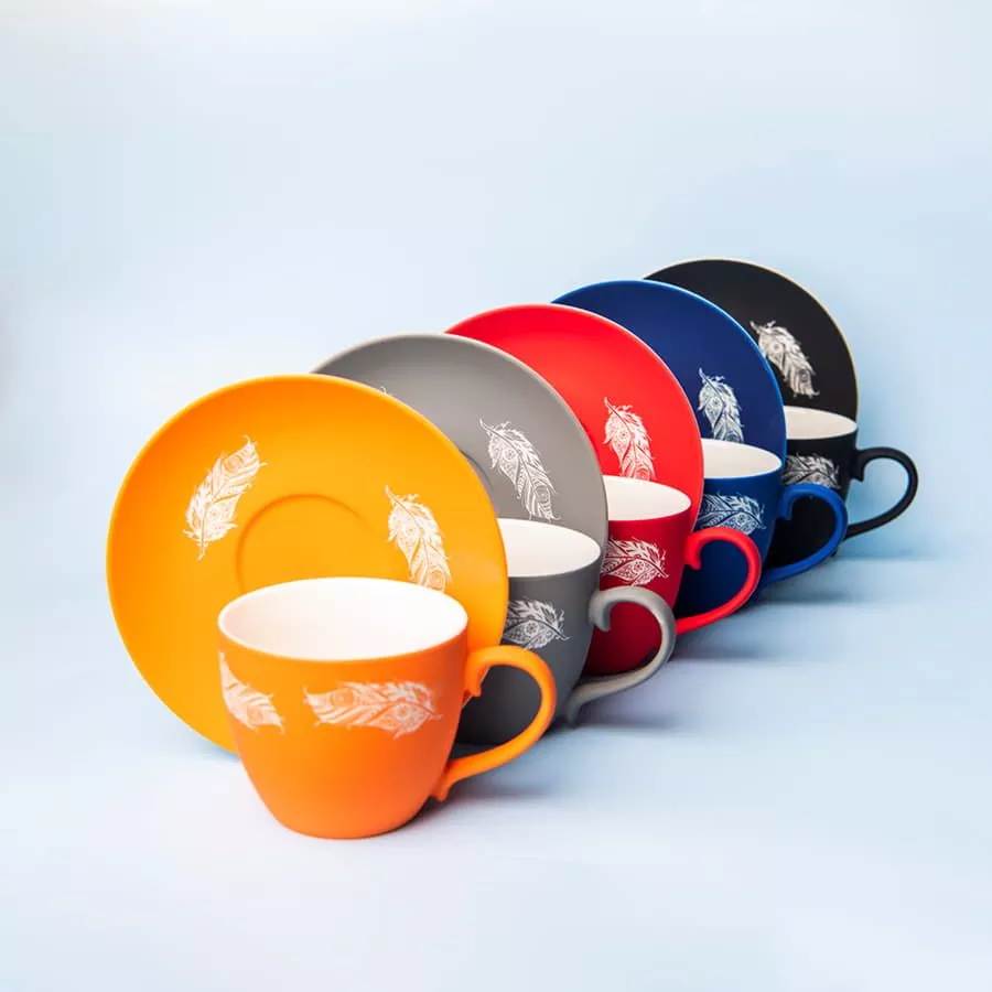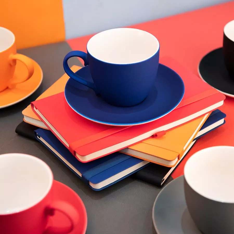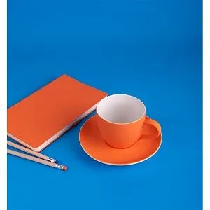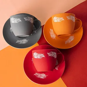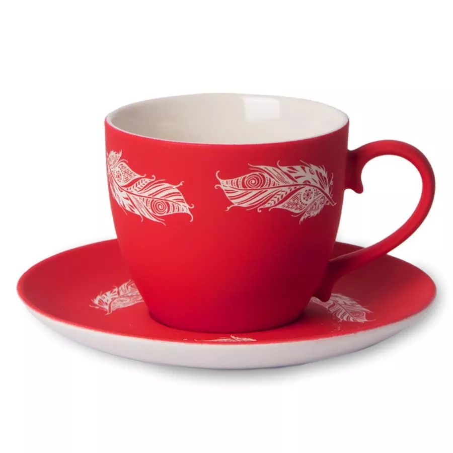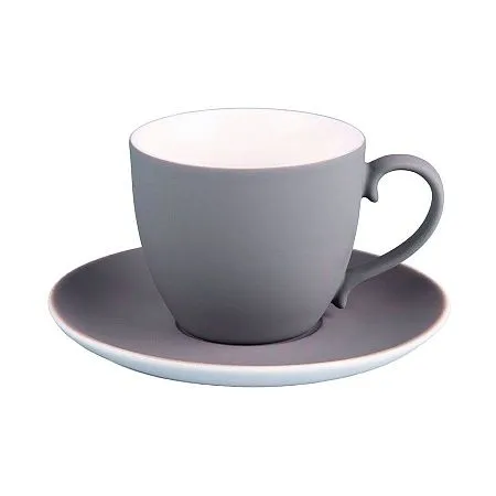Чайная пара из фарфора с прорезиненным покрытием soft-touchЧашка классической формы и удобное глубокое блюдцеЦвет близкий к Pantone 200C
