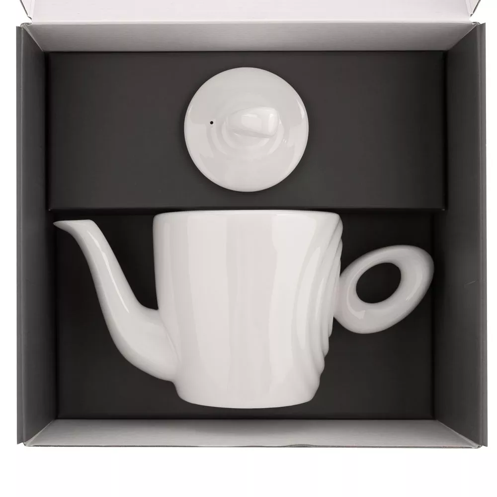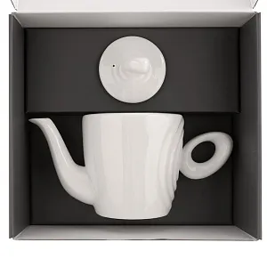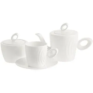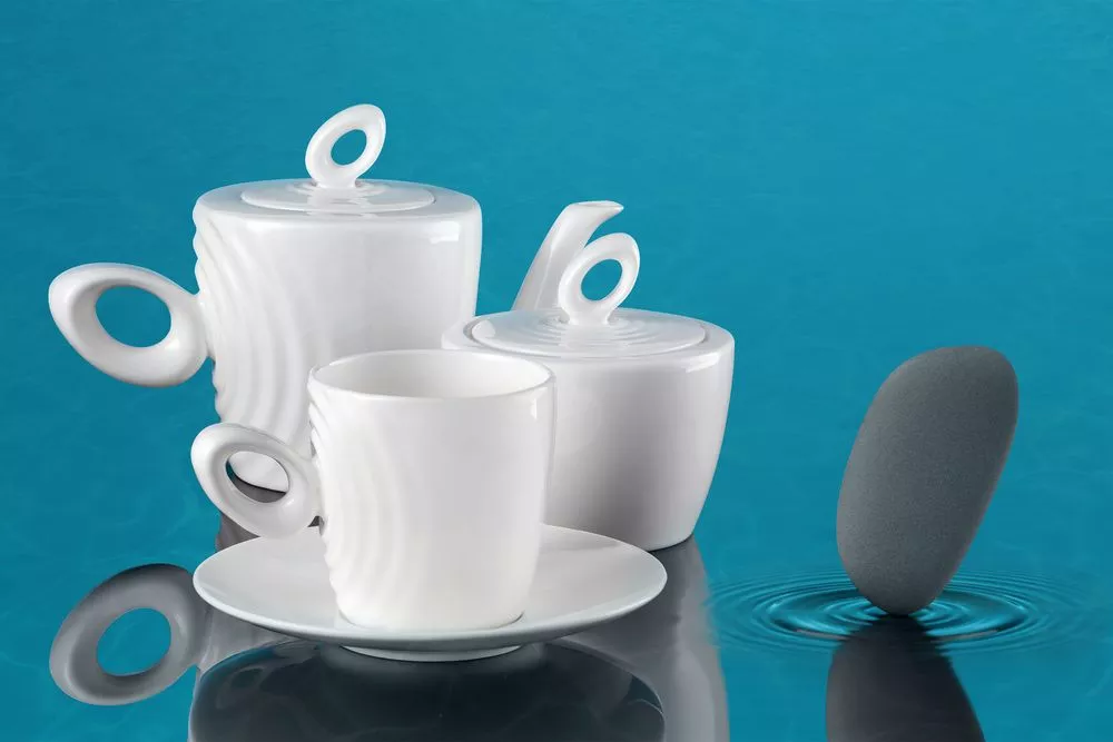 Форма сервиза создана в скульптурной технике: фарфор запечатлел словно сам момент движения. Необычная ручка предметов символизирует камень, от которого появляются завораживающие круги на воде — корпусе изделия.
