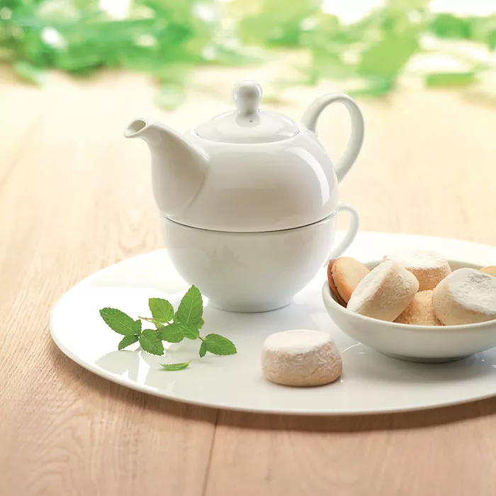 Чайник объемом 400 мл и чашка из белой керамики. Упаковка - черная подарочная, картонная. Тампопечать: нельзя мыть в посудомоечной машине. Деколь: можно мыть в посудомоечной машине.