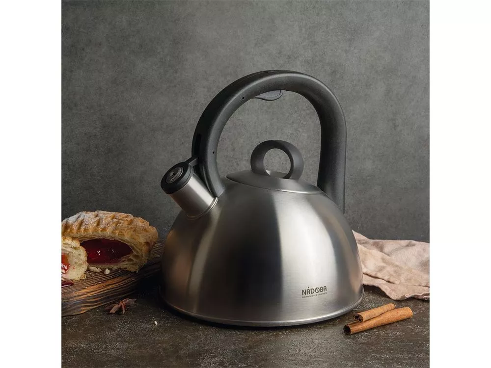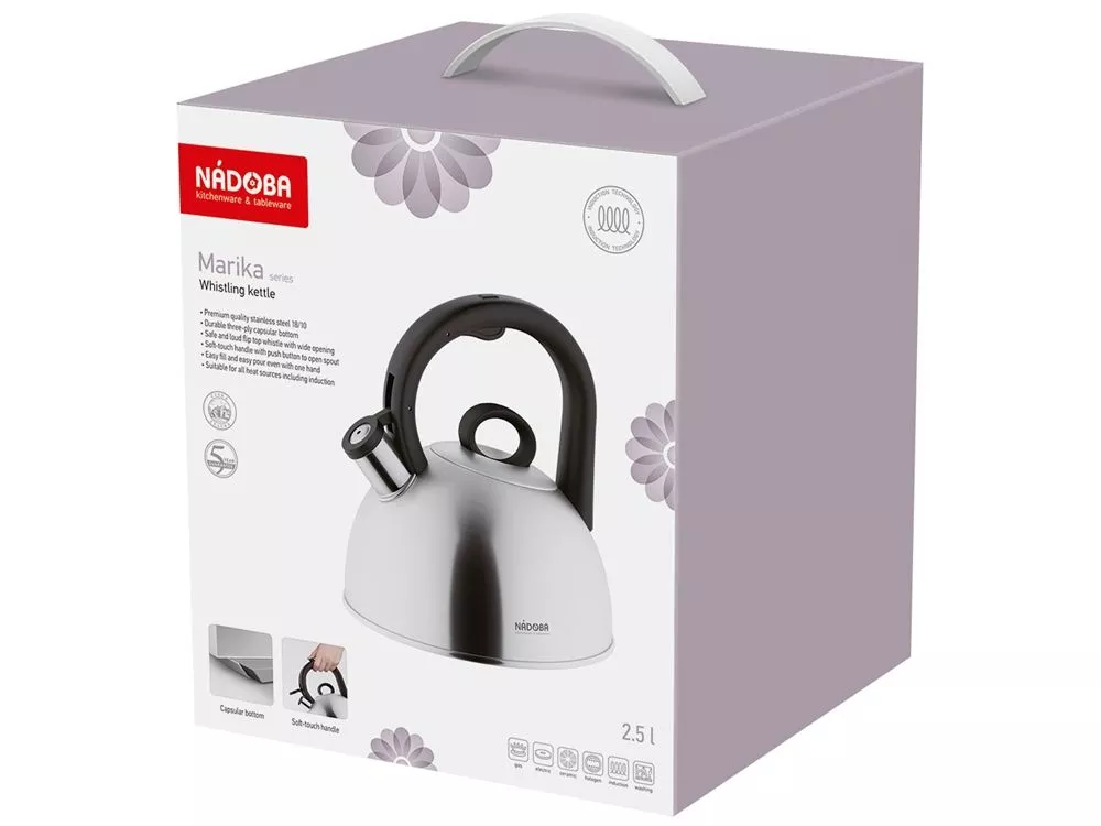 - Чайники серии Marika изготовлены из высококачественной нержавеющей стали 18/10. В серию NADOBA Marika входит чайник объёмом 2,5 л. - Прочное трехслойное капсульное дно изделий не деформируется и служит для равномерного распределения тепла по всей площади посуды. - Безопасный и громкий широко открывающийся свисток позволяет наполнять чайник через носик, не открывая крышку, и вовремя проинформирует, что вода уже вскипела. - Эргономичная ненагревающаяся ручка с покрытием софт-тач с кнопкой для открывания носика позволяет легко наливать воду из чайника, а также наполнять его даже одной рукой. - Подходит для всех типов плит, включая индукционные. - Гарантия на всю посуду серии Marika 5 лет.