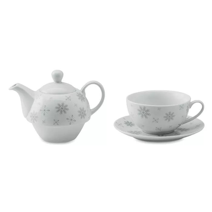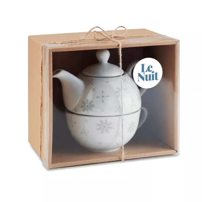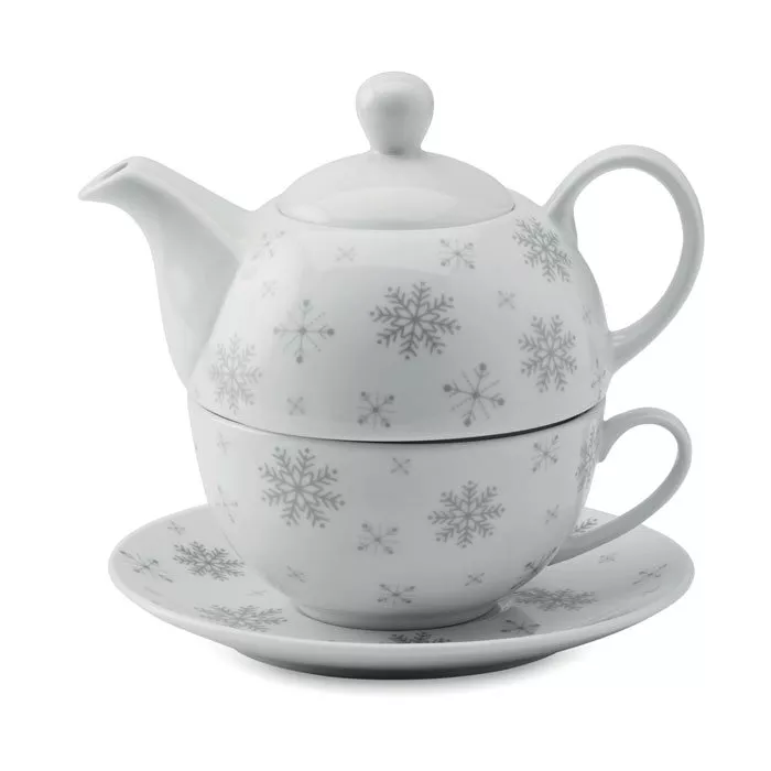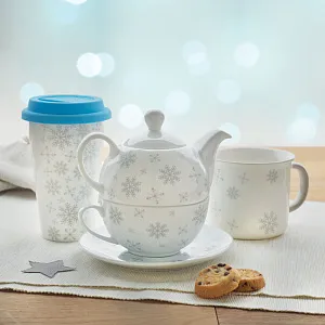 Набор чайный. Чайник 400 мл с принтом снежинки и керамической чашкой 260 мл. Представлен в подарочной коробке. При тампопечати мытье в посудомоечной машине небезопасно.