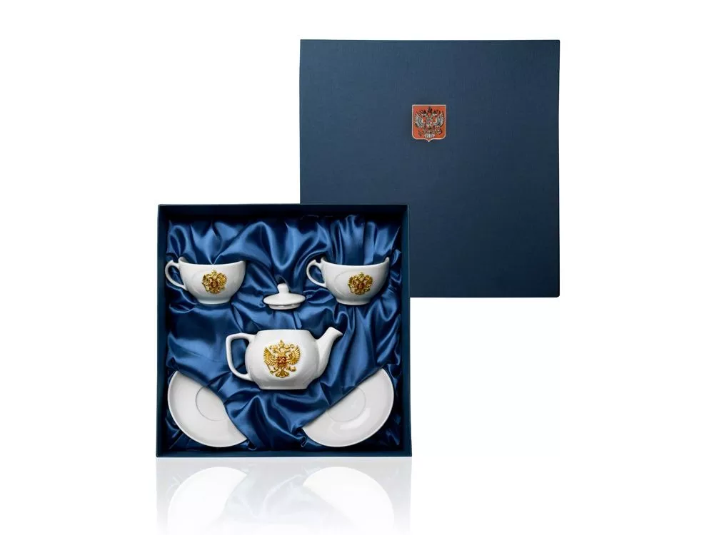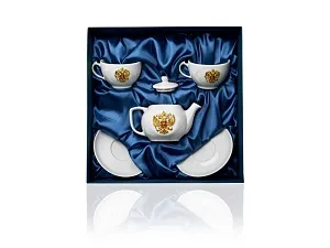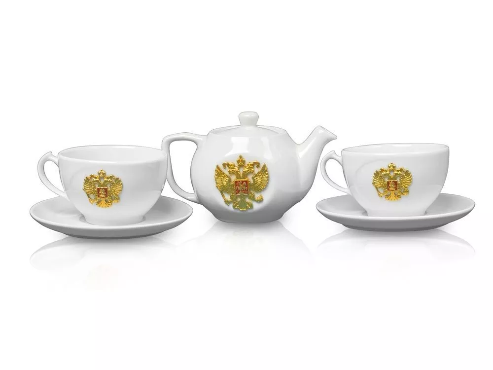 Подарочный набор чайных пар с фарфоровый чайником Виват, Россия! (5 предметов). Фарфоровый чайник и две фарфоровые чайные пары и блюца с чеканным металлическим декором Двуглавый орел. Накладка изготовлена из алюминия методом чеканки с декоративной отделкой под золото. Ручная работа.