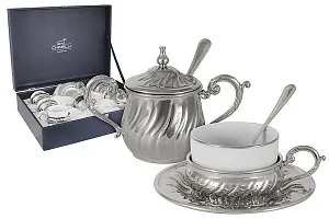 В набор входит: 6чашек 0.15л, 6 блюдец, 6 ложек, сахарница с ложкой 0.25л