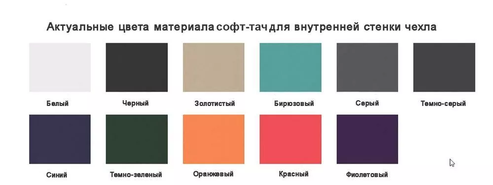 Снаружи чехол выполнен из искусственного материала, имитирующего сафьяновую кожу, внутри — из материала с эффектом софт-тач.