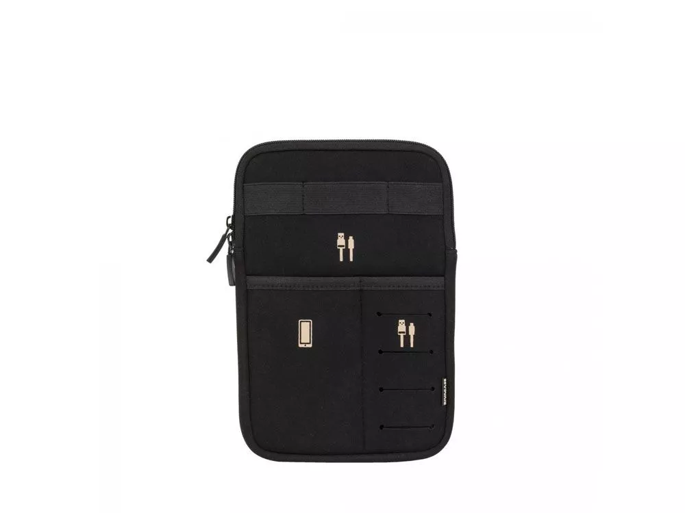 Чехол для планшета и хранения аксессуаров. Основное отделение подходит для большинства 7-8' планшетов 1 сетчатый карман на молнии для мелких предметов 1 внешний карман 1 внешний карман с петлями для кабелей 3 эластичные петли для кабелей Материал: неопрен, полиэстер Цвет: черный Внутренний размер: 155 x 230 x 20 мм. Внешний размер: 175 x 250 x 25 мм.