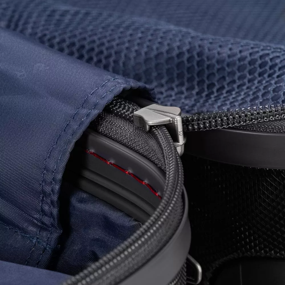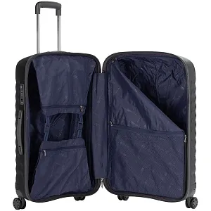 - Чемодан с 2 отделениями: одно из них с прижимом для одежды и дополнительными карманами, второе — с разделителем на молнии и сетчатым карманом