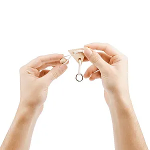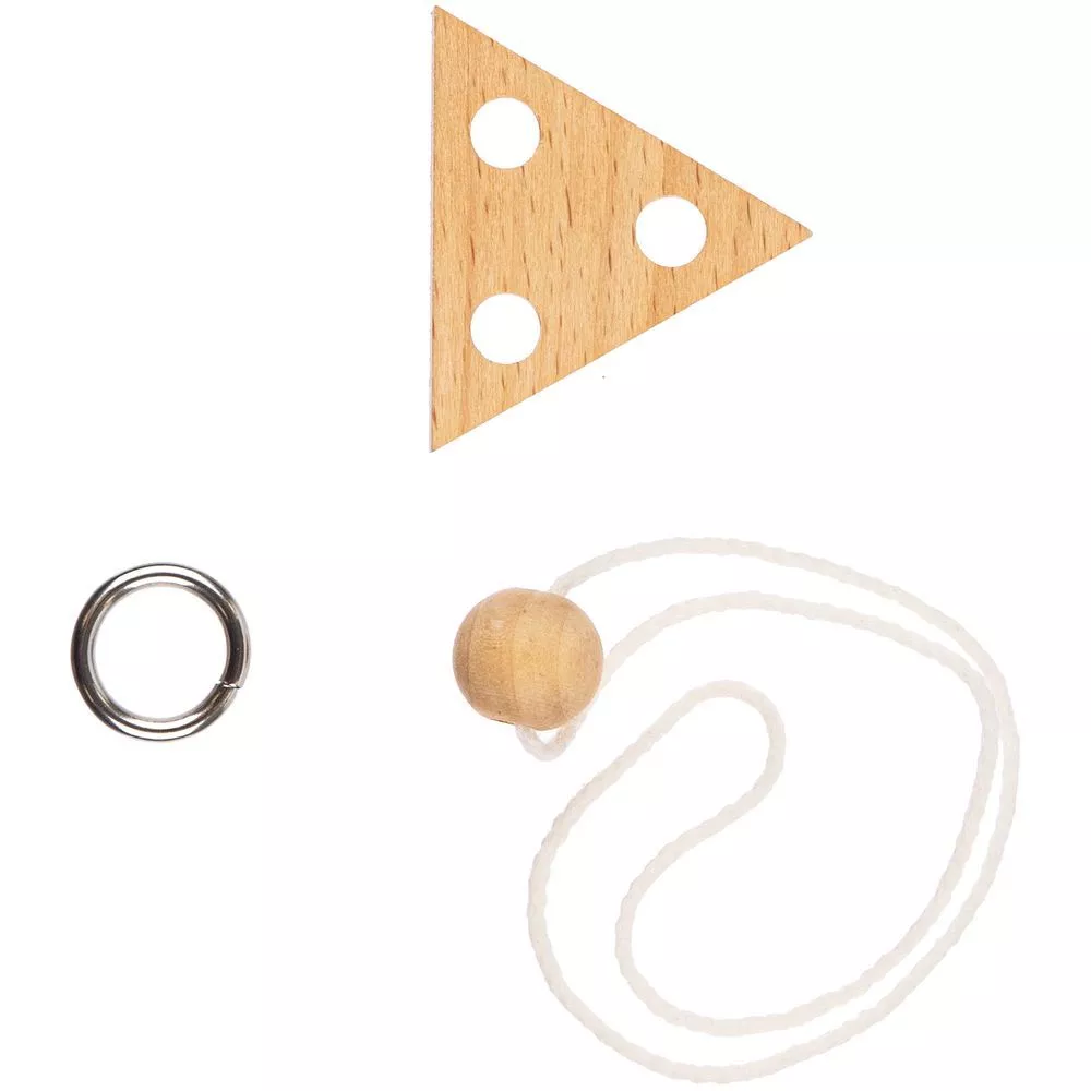 Миниатюрная головоломка Combi из натуральных материалов. Задача головоломки — разъединить ее элементы, не развязывая веревку.