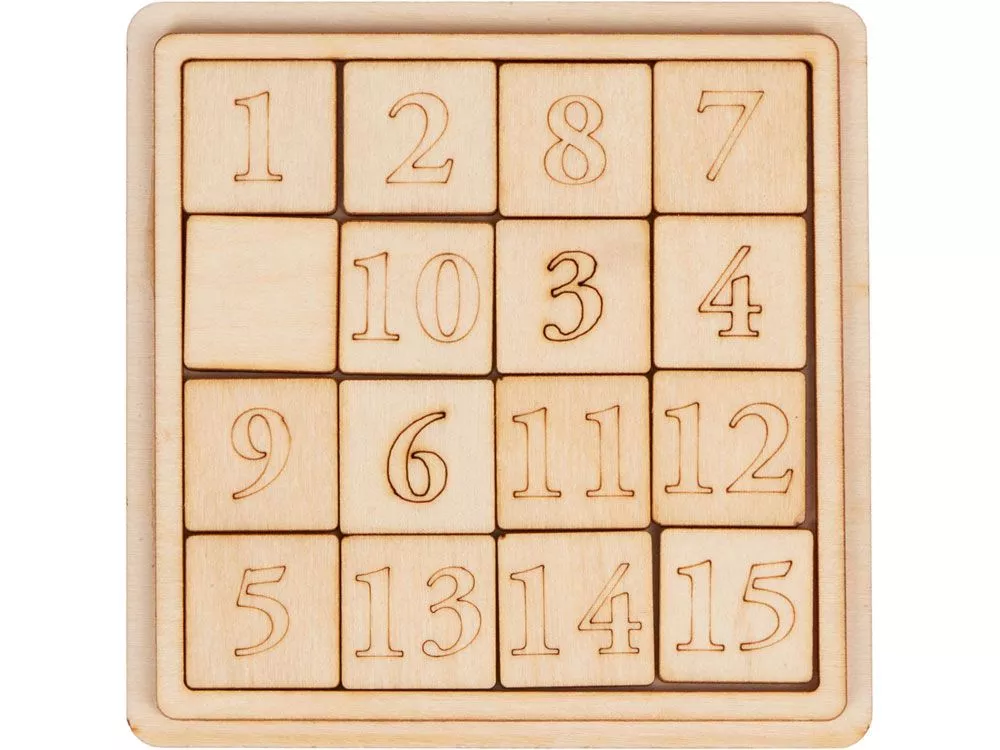 Пятнашки - одна из самых популярных игр, давно ставшая классикой. Задача игрока - выставить все цифры в правильном порядке от 1 до 15. Поле из берёзовой фанеры вмещает в себя 15 квадратов с цифрами и одно пустое место для перемещения цифр. Игра компактная и лёгкая, и поможет весело провести время в пути или в перерыве. - увлекательная развивающая игра; - натуральный материал; - удобно брать с собой; - компактная. Гравировка (CO2 лазер) (Без чернения) на данный товар осуществляется бесплатно. Оплачивается только настройка оборудования в размере 1000 рублей на весь тираж.
