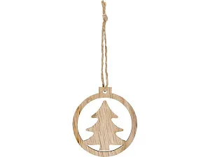 Деревянное украшение круглой формы с елкой внутри, с петлей и шнурком. Упаковано с открыткой из крафт-бумаги на обратной стороне.