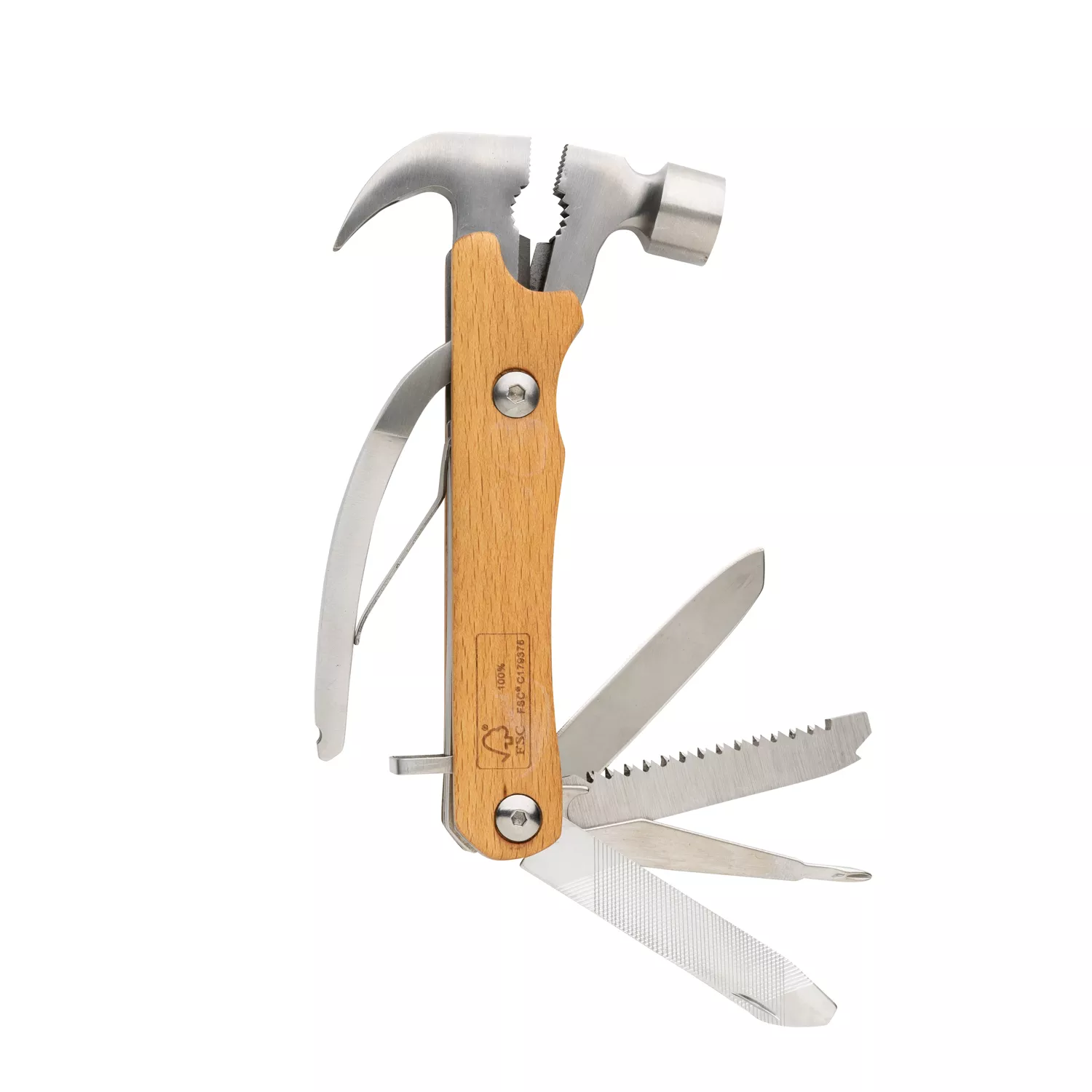 Деревянный мультитул с молотком пригодится всем, кто любит, чтобы инструменты всегда были под рукой и содержались в порядке. Универсальный и стильный мультитул изготовлен из стопроцентного бука, сертифицированного FSC, и прочной нержавеющей стали. твердость стали по Роквеллу — 42-52.
