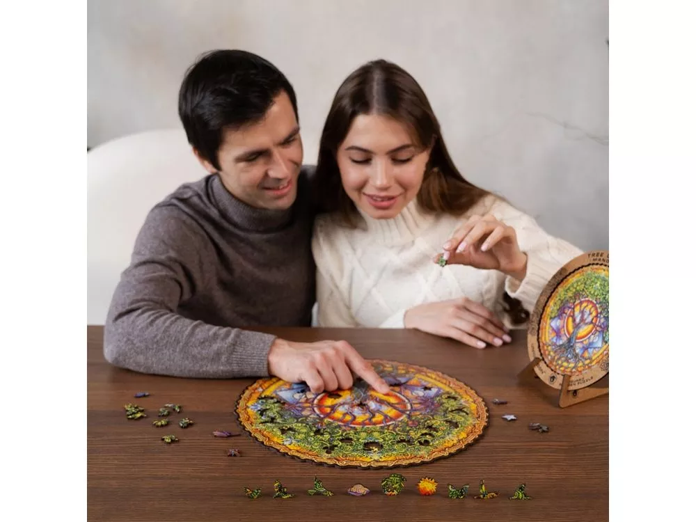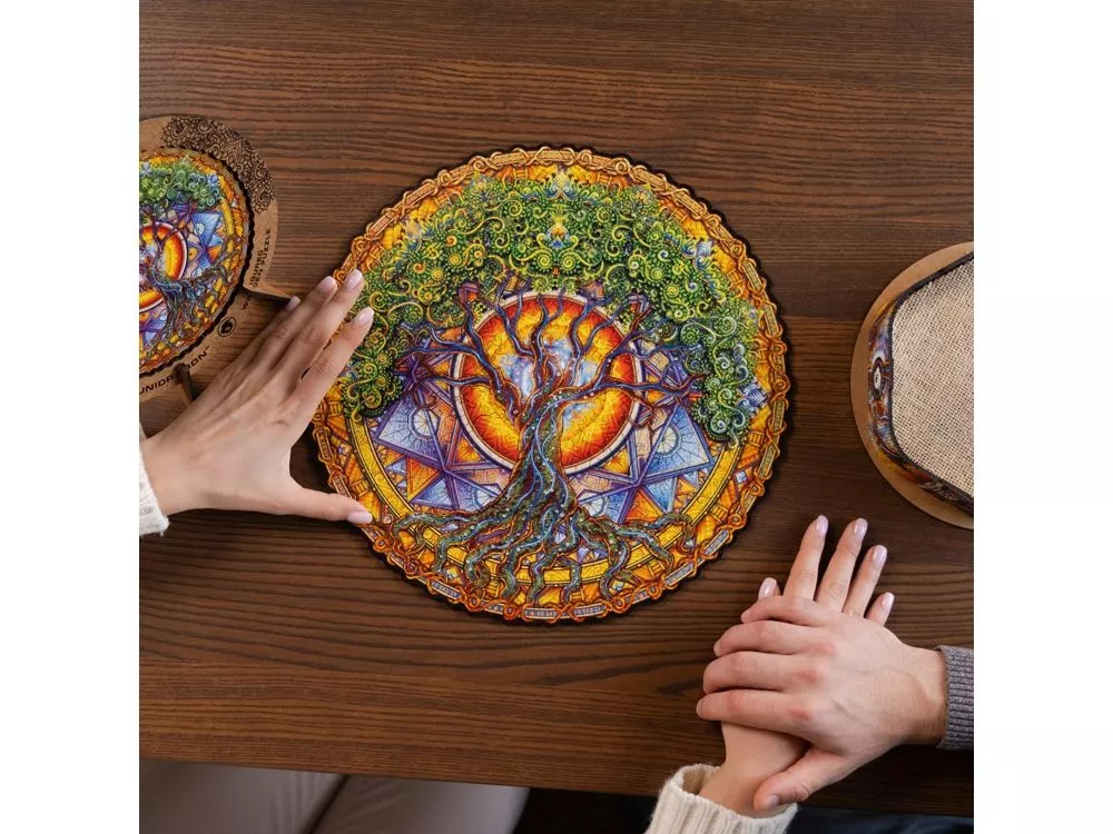 Древние легенды рассказывают, что в самом центре Земли растет удивительное Древо. Его ветви достают до самого неба, корни уходят глубоко в землю, а в тени ствола прячутся цветы и животные. Его величественная крона сплетается с корнями, образуя единый, неразрывный круг — как символ бесконечной жизни. Мы воплотили старинные легенды в нашем пазле Мандала Древо Жизни. Во время сборки вам встретятся бабочки и звезды, птицы и цветы, животные и планеты. А чтобы усилить медитативный эффект, мы добавили два типа абстрактных деталей — жесткие, геометрические и мягкие, плавные. Сквозь всю иллюстрацию тянутся прожилки, по которым словно течет сама жизнь — эти детали пазла сияют, потому что покрыты лаком! Этот же эффект мы повторили на подарочной коробке. В природе ничего не пропадает бесследно — все перерождается, видоизменяется и переплетается. На месте старых листьев появляются новые, а из множества абстрактных деталей в самом центре мандалы — вырастает фигура Древа. Говорят, что прожитая не зря жизнь — та, после которой на свете осталось что-то доброе. Помните про сына, дом и дерево? Наше Древо Жизни — как раз такой символ бесконечного развития, связи всего живого на земле, под землей и на небе. Его можно собрать отдельно, а потом соединить с остальным пазлом. Это великолепный подарок — символ перерождения, нового этапа в жизни и надежды на то, что все сложится. - Количество деталей: 200шт. - Размер собранного пазла: 25х25см - Длительность сборки: от 4 часов - Детали уникальной формы - Прочные и долговечные детали с безупречным сцеплением - Премиальная подарочная коробка из дерева, которую можно персонализировать Трафаретная печать по твердым материалам (1 цвет (цветные изделия)) на данный товар осуществляется бесплатно. Оплачивается только настройка оборудования в размере 6400 рублей на весь тираж.