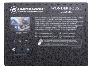 Деревянный пазл Wonderhouse перенесет вас в удивительное место. Высоко в горах скрыта от чужих глаз тихая долина. Она прячет загадочный дом со старинным каменным мостом. Оставьте позади тревоги, и — постучитесь в его двери. Здесь проходит зыбкая граница между временами года. Глубокая тишина древних гор окутывает все вокруг, а близкие люди становятся еще ближе. Просто всмотритесь: это настоящая магия, созданная самым могущественным волшебником — природой. Именно она подсказала нам, каким должен быть рез этого пазла. Горные вершины состоят из деталей с острыми краями. Это напоминание о жизненных вызовах и стремительно меняющихся обстоятельствах. А дом и журчащий перед ним ручей сделаны из деталей с плавными очертаниями. Они говорят о семейном тепле, поддержке близких людей, и уюте. Технология Unitouch делает картинку объемной, позволяя вам почувствовать себя частью этого волшебного места. Ощутите края скал на кончиках пальцев, почувствуйте гладкость бегущей воды, погрузитесь в ощущение покоя, которым дышат здешние горы. - Количество деталей: 500шт. - Размер собранного пазла: 42х29,7см - Длительность сборки: от 6 часов - Детали уникальной формы - Прочные и долговечные детали с безупречным сцеплением - Премиальная подарочная коробка из дерева, которую можно персонализировать Трафаретная печать по твердым материалам (1 цвет (цветные изделия)) на данный товар осуществляется бесплатно. Оплачивается только настройка оборудования в размере 6400 рублей на весь тираж.
