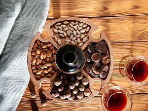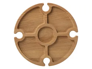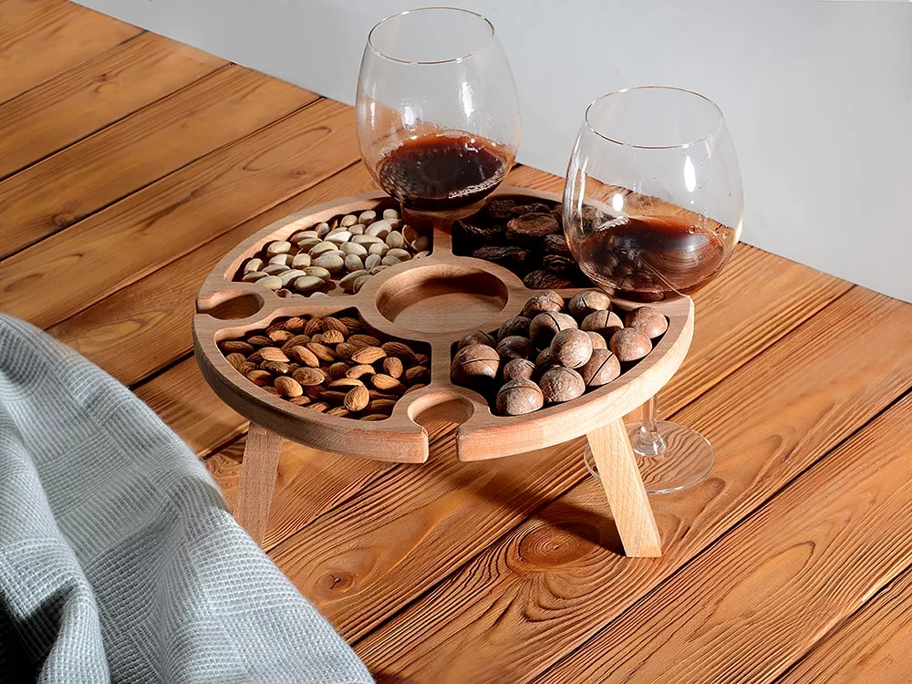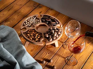 Деревянный столик на складных ножках может быть использован как во время пикников на открытом воздухе, так и дома, где его можно использовать прямо на полу. Столик позволяет подать 4 вида различных закусок, не смешивая их, благодаря четырем сепарированным секциям, в которые можно поместить ягоды, орехи и другие снеки, желательно, сухие либо подающиеся в масле (оливки, маслины). Четыре держателя для бокала особенно актуальны во время отдыха на природе, где каждый участник пикника обязательно оценит возможность зафиксировать посуду для вина. Помимо функциональности столика не можем не отметить и его эстетичность, которая позволяет изящно преподнести вино и снеки к нему. - 4 вместительных отделения для закусок - 4 держателя для бокалов - натуральный бук, обработанный минеральным пищевым маслом - удобные складные ножки - для приятных вечеров на природе и дома Натуральный бук, из которого выполнен столик, как и любое дерево, требует ухода, который существенно продлит ему жизнь и позволит радовать своего обладателя в течение многих лет. Пропитывание пищевым маслом (растительное, льняное и т.д.) раз в один-два месяца поможет сохранять свежий вид изделия. Рекомендации по использованию: - не рекомендуется использовать в посудомоечной машине, микроволновой печи, замачивать в раковине с водой; - не использовать агрессивные моющие средства; - использовать мягкую губку для очищения; - вытирать насухо после мытья. Гравировка (CO2 лазер) (Без чернения) на данный товар осуществляется бесплатно. Оплачивается только настройка оборудования в размере 1000 рублей на весь тираж.