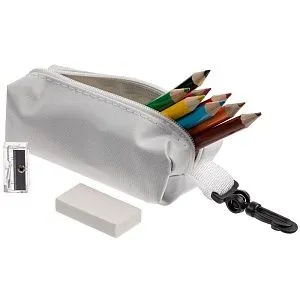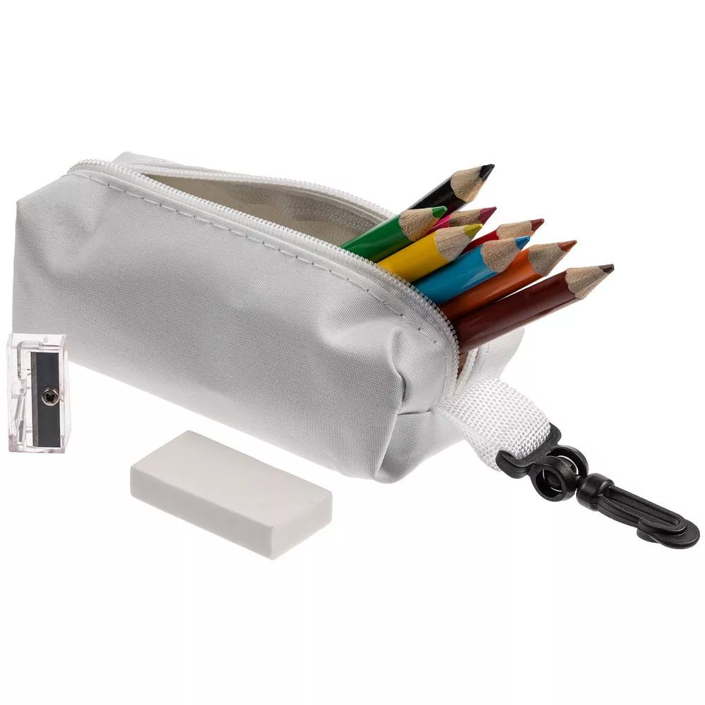 Яркий детский набор с бутылкой для воды, светоотражателем и набором цветных карандашей.