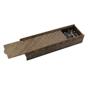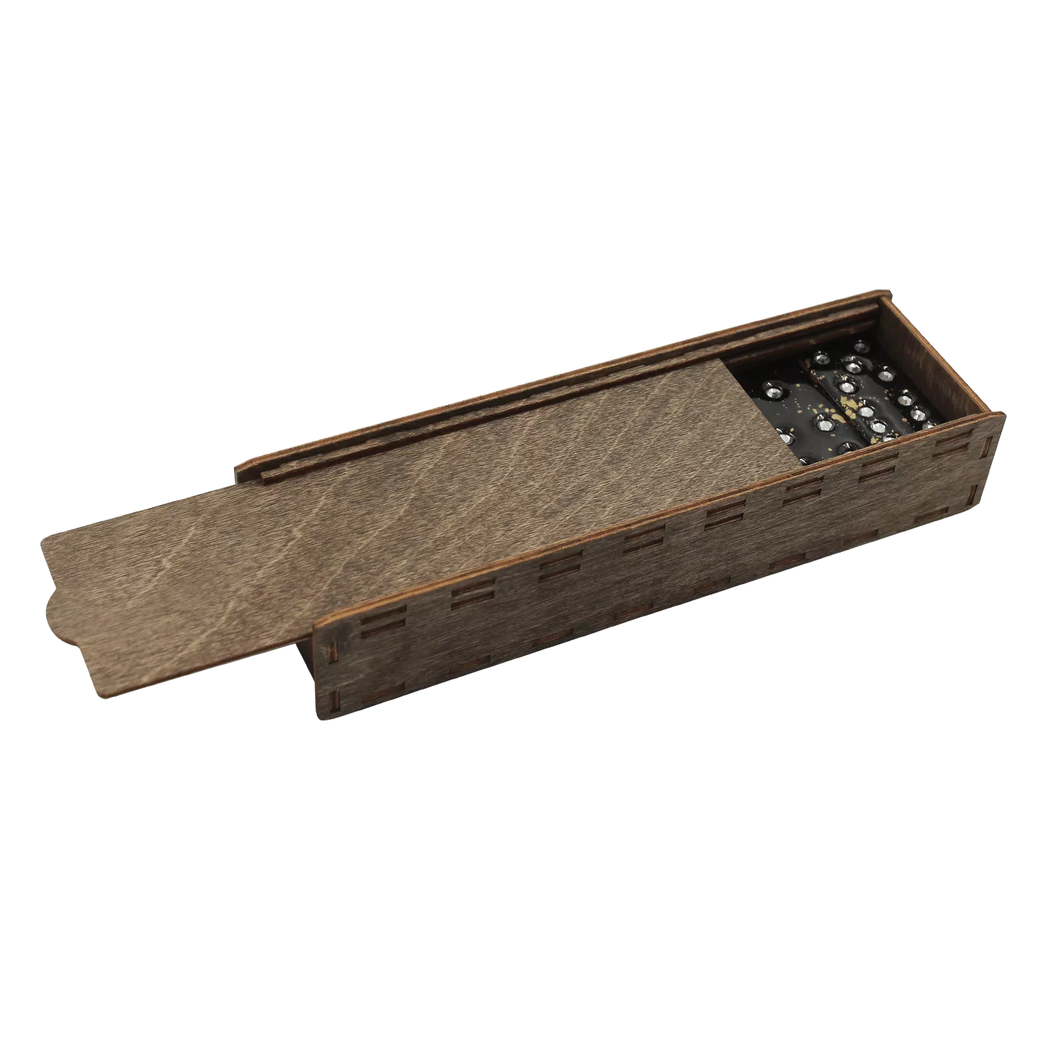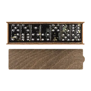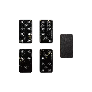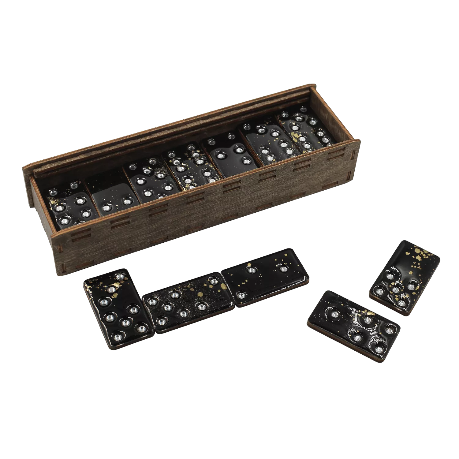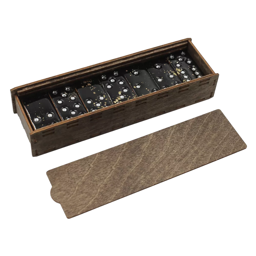 Домино WIN-WIN в стильном деревянном пенале. Кости глянцевого черного цвета из дерева и ювелирной смолы с золотыми вкраплениями и стразами произведены вручную. Элегантный и лаконичный дизайн.