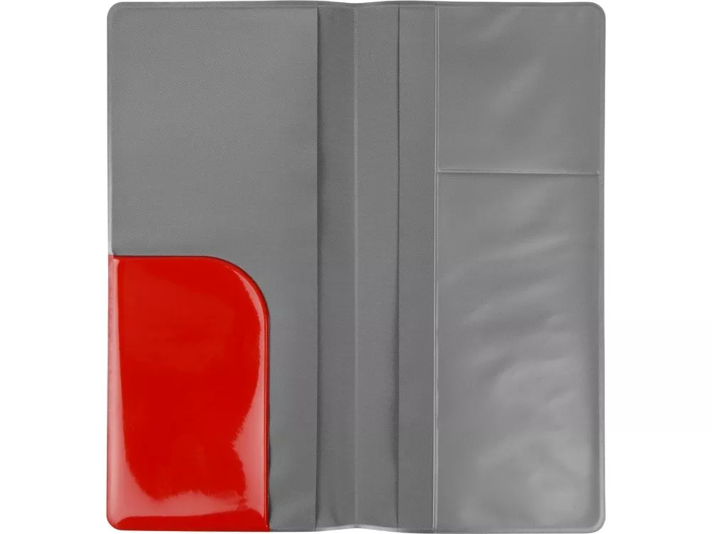 Дорожное портмоне – полезный аксессуар для занятых людей, которым приходится часто путешествовать. • Аксессуар выполнен из морозостойкого и прочного ПВХ; • внутри отделан контрастным серым материалом; • многофункционален: предусмотрено большое количество отделений для самых разных документов, таких как паспорт, билеты, карточки, водительские права; • гладкая поверхность предназначена для нанесения логотипа компании.
